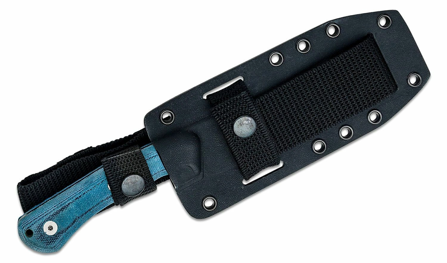 De handgreep van blauwe Micarta met getextureerd oppervlak zorgt voor een zekere en comfortabele grip, ook bij natte omstandigheden. Het koordoog maakt een zekere bevestiging mogelijk. De set bevat een robuuste Kydex schede die compatibel is met het MOLLE-systeem voor flexibel dragen aan uitrusting of riem.