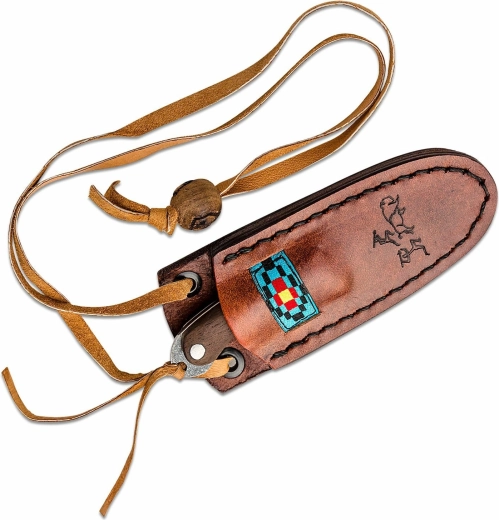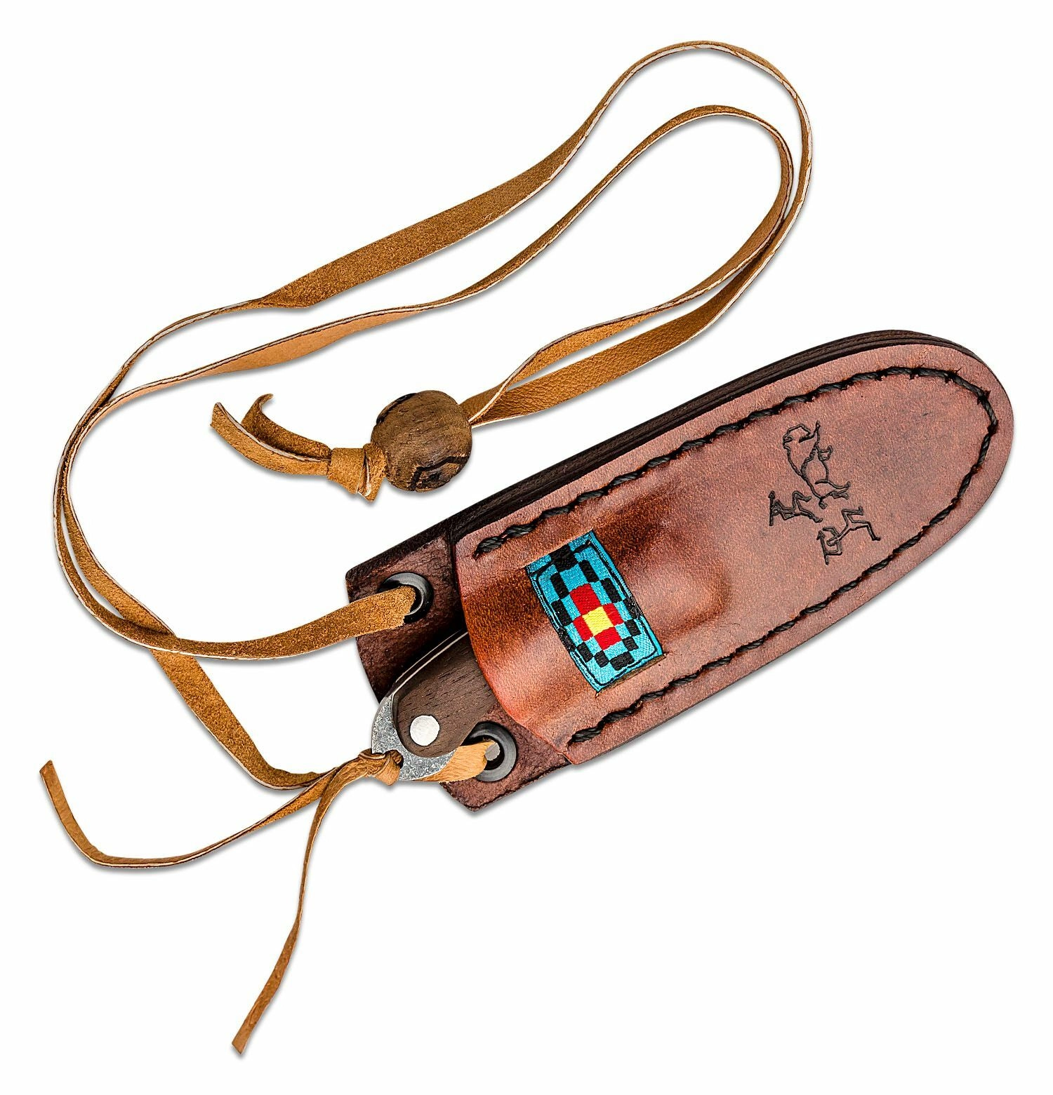 De handgreep van walnoothout aangevuld met turkooisteen biedt een comfortabele en zekere grip, ook onder ongunstige omstandigheden. Het mes wordt geleverd met een lederen schede versierd met een jachtmotief en een koord, waarmee je het veilig en stijlvol om de nek kunt dragen.