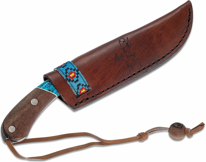 Het handvat combineert walnoothout en turkooissteen voor een zekere en comfortabele grip, ook onder veeleisende omstandigheden. De stijlvolle leren schede met versiering zorgt voor veilig dragen en snelle toegang.