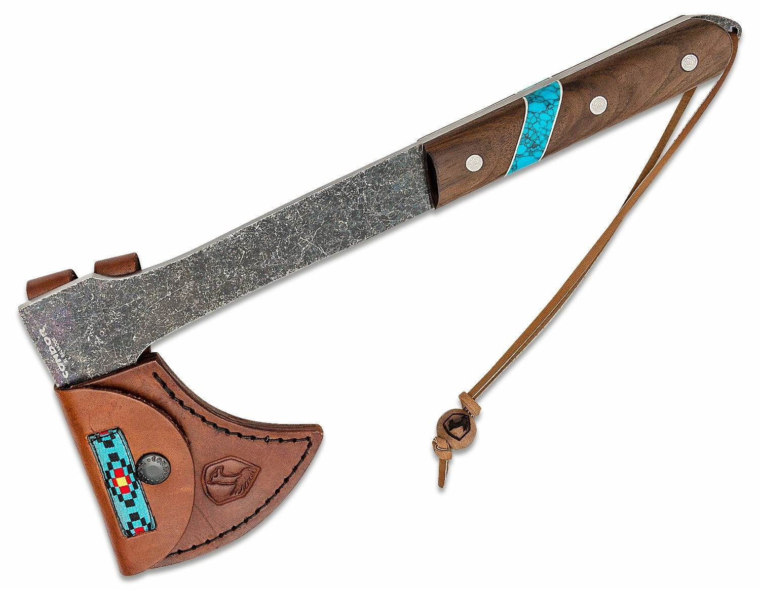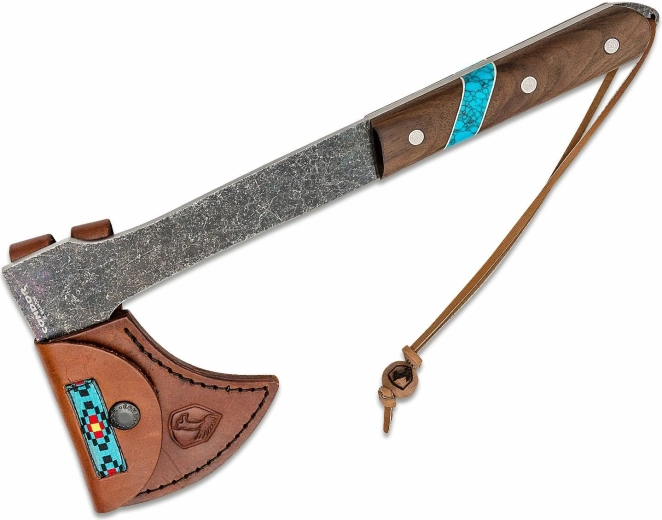 Lichte en duurzame tomahawk voor gebruik in de natuur. Kop van 1075 koolstofstaal met natuurlijke afwerking, full‑tang doorlopende constructie en ergonomische handgreep van notenhout met elementen van turkoois. Inclusief hoogwaardige lederen schede. Ideaal voor kamperen, bushcraft en outdooractiviteiten. 1075 koolstofstaal, full‑tang constructie, notenhout, lederen schede meegeleverd.