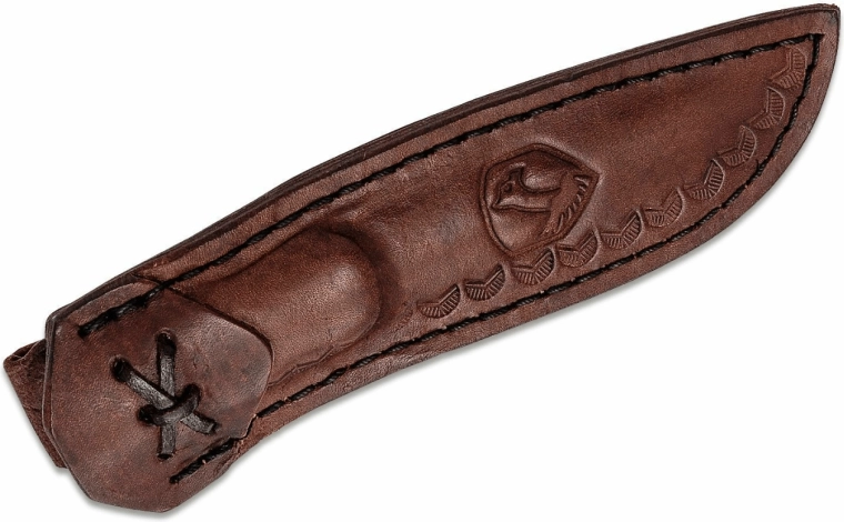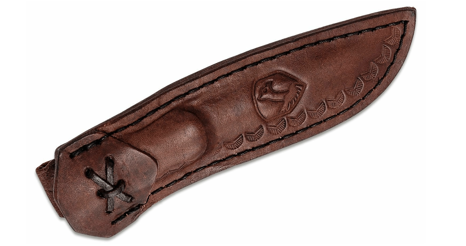 De handgreep van hoogwaardig notenhout is bevestigd met drie messing klinknagels en versierd met messing draad, wat zowel de esthetiek als de stabiliteit van de grip verhoogt. De handgemaakte lederen schede maakt comfortabel en veilig dragen aan de riem mogelijk, zodat u het mes altijd bij de hand hebt.