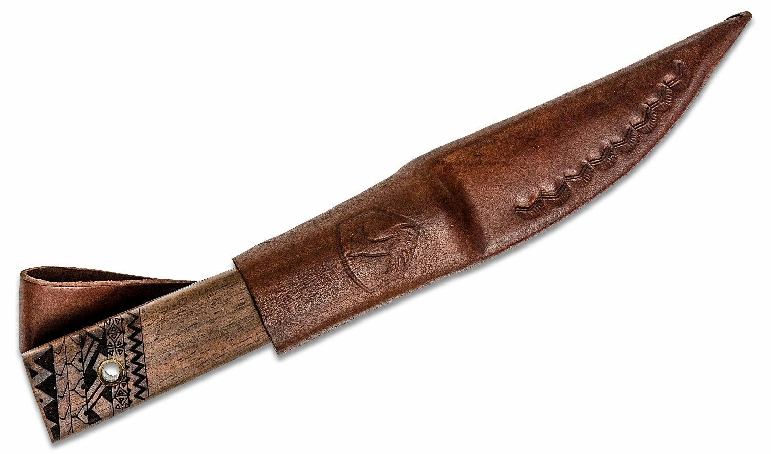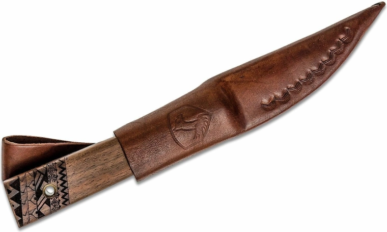 De handgreep van notenhout ligt uitstekend in de hand en de messing omwikkeling zorgt niet alleen voor een aantrekkelijke uitstraling, maar ook voor een zekerdere grip. De afwerking met gegraveerde details en een koordoog voegt functionaliteit en esthetiek toe. Inbegrepen is een hoogwaardige lederen schede voor veilig dragen aan de riem.