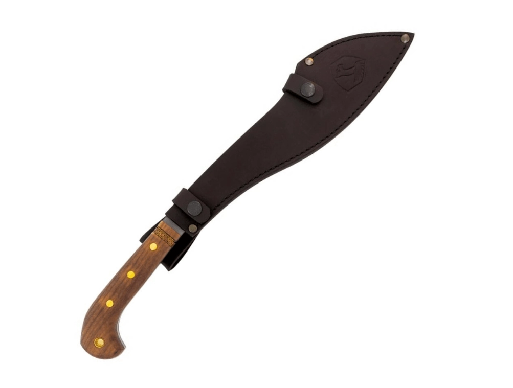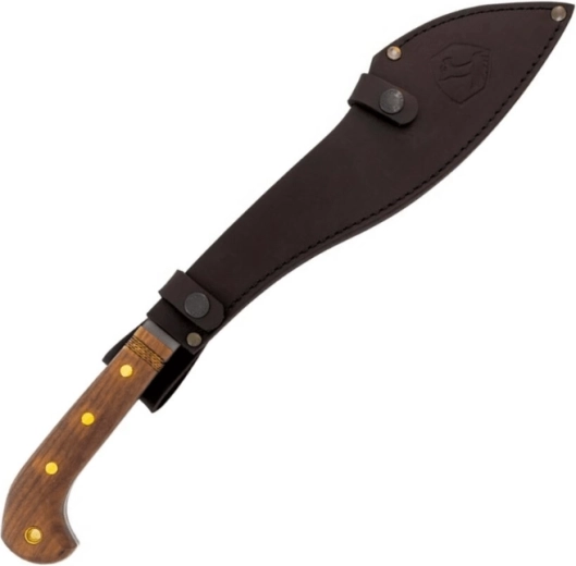 De ergonomische handgreep van walnotenhout met verbreed uiteinde zorgt voor een zekere greep, ook bij krachtig hakken. De machete wordt geleverd met een hoogwaardige leren schede voor veilig dragen en snel trekken in het veld.