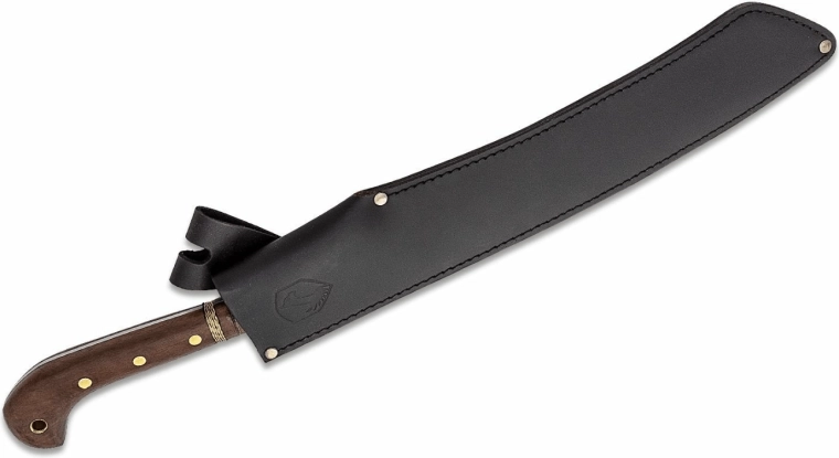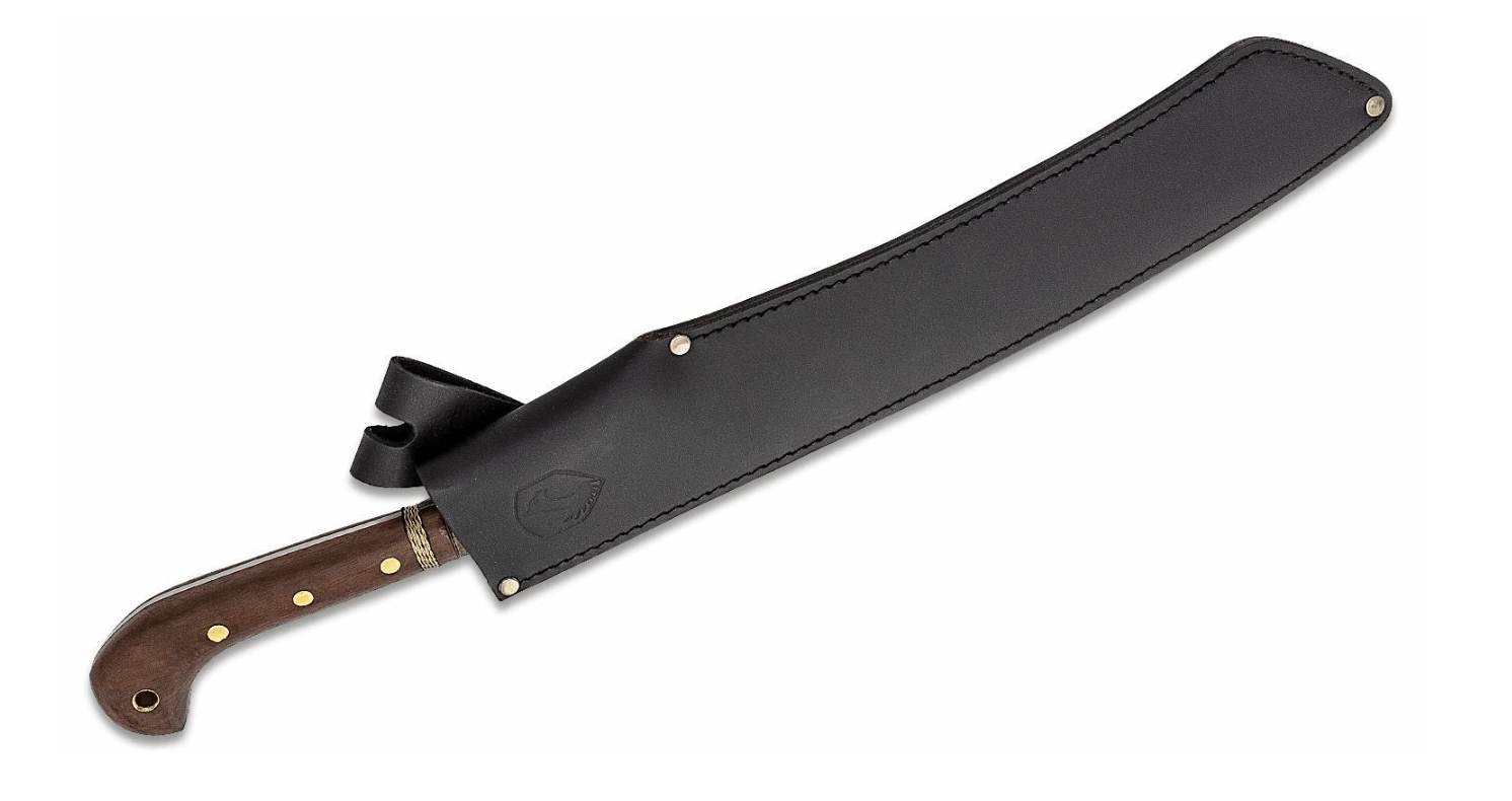De ergonomische handgreep van hardhout met decoratieve messing wikkeling ligt prettig in de hand, terwijl de verbrede pommel wegglijden bij krachtige slagen voorkomt. Voor veilig dragen wordt een stevig leren foedraal meegeleverd.