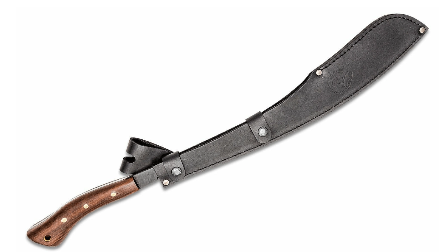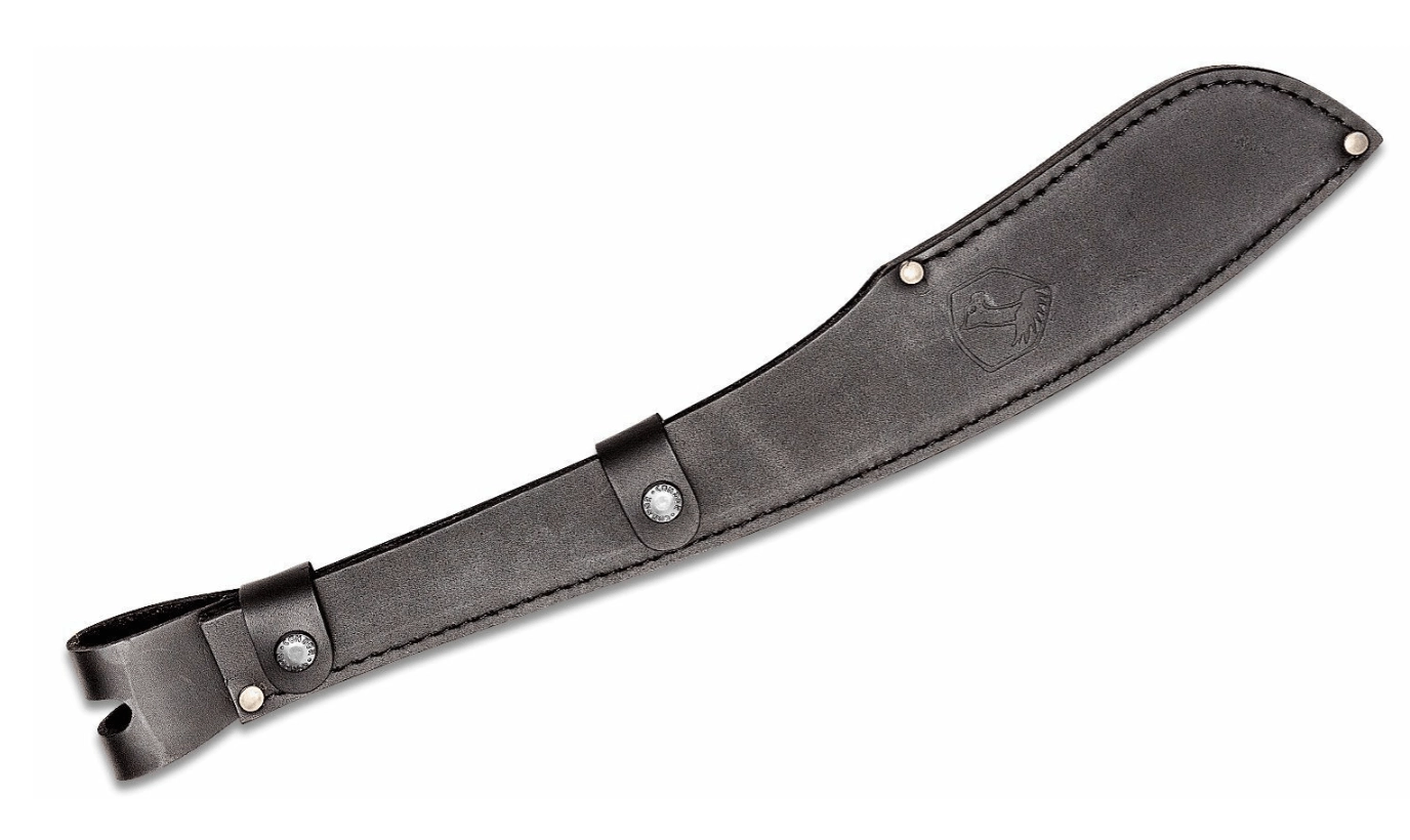 De stevige leren schede met riemlus beschermt zowel het lemmet als de gebruiker en zorgt ervoor dat je de machete altijd bij de hand hebt.