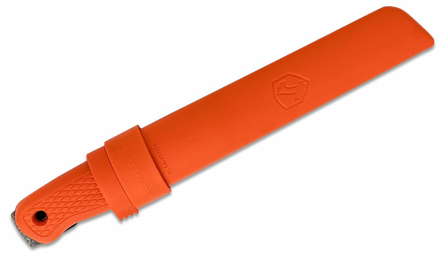 De ergonomische handgreep van duurzaam polypropyleen in goed zichtbare oranje kleur ligt uitstekend in de hand en heeft aan het uiteinde een oog voor een koord. De set omvat een lichte en stevige schede van polypropyleen, compatibel met het Bushglider-model, die comfortabel dragen aan zowel de rechter- als linkerzijde mogelijk maakt.