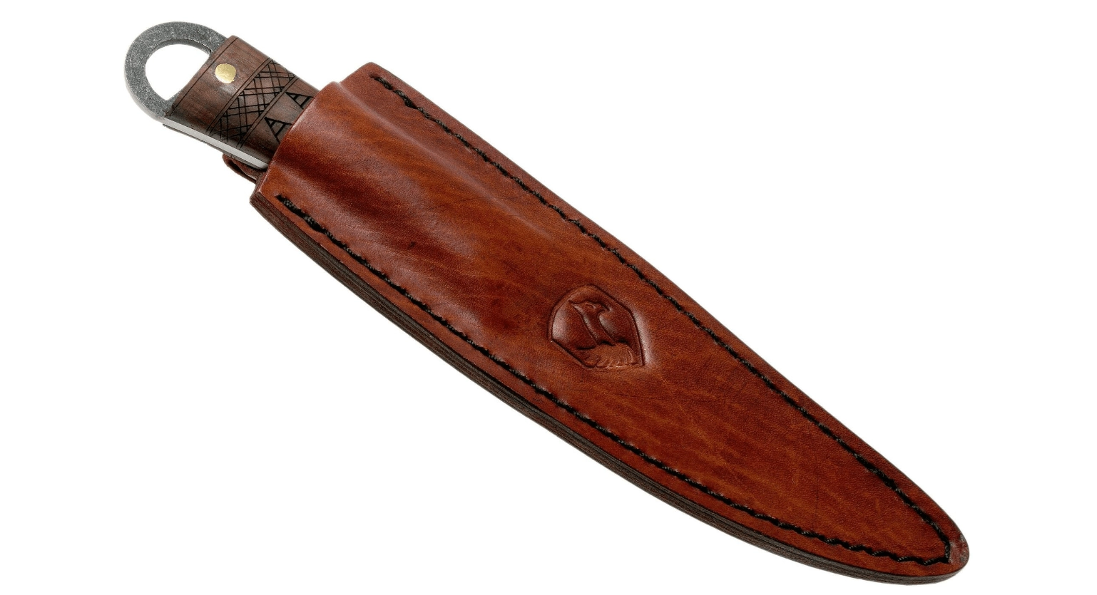 Het handvat van hoogwaardig notenhout met een uitgesproken nerf is stevig aan het lemmet bevestigd met drie messing klinknagels. Aan het uiteinde van het handvat bevindt zich een stalen oog voor het doorhalen van een koord of lus. In de verpakking zit een zorgvuldig afgewerkte lederen schede voor veilig en stijlvol dragen, zowel in het veld als in de collectie.