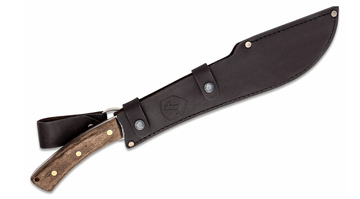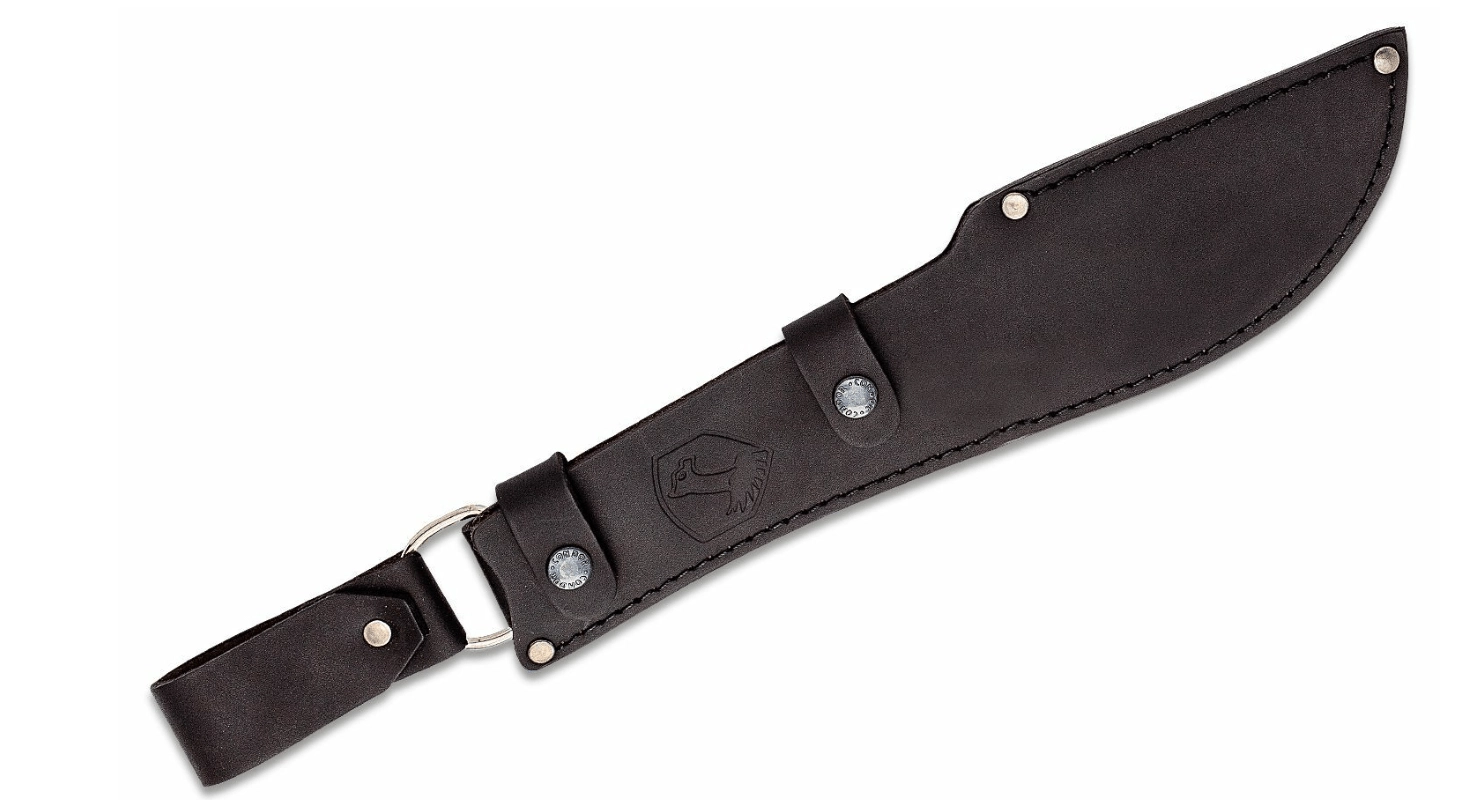 Hoogwaardig leren foedraal met lus, sterke stiksels en klinknagels beschermt het lemmet en maakt veilig dragen in het veld mogelijk.