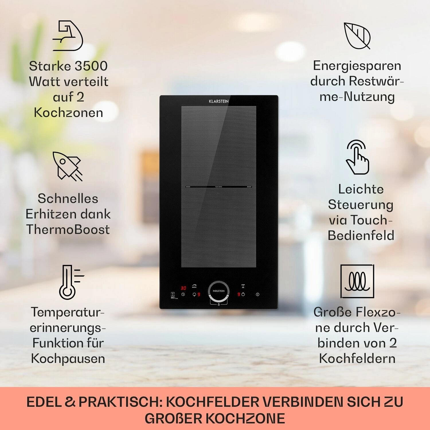 De compacte en krachtige inductiekookplaat Klarstein Delicatessa Slim biedt flexibel koken, laag energieverbruik en een elegant glaskeramisch oppervlak. Hij heeft twee kookzones met een totaal vermogen van 3500 W, VarioHeating om ze te combineren tot één flexzone, ThermoBoost voor snel opwarmen en een handig touchbedieningspaneel met timer tot 99 minuten.