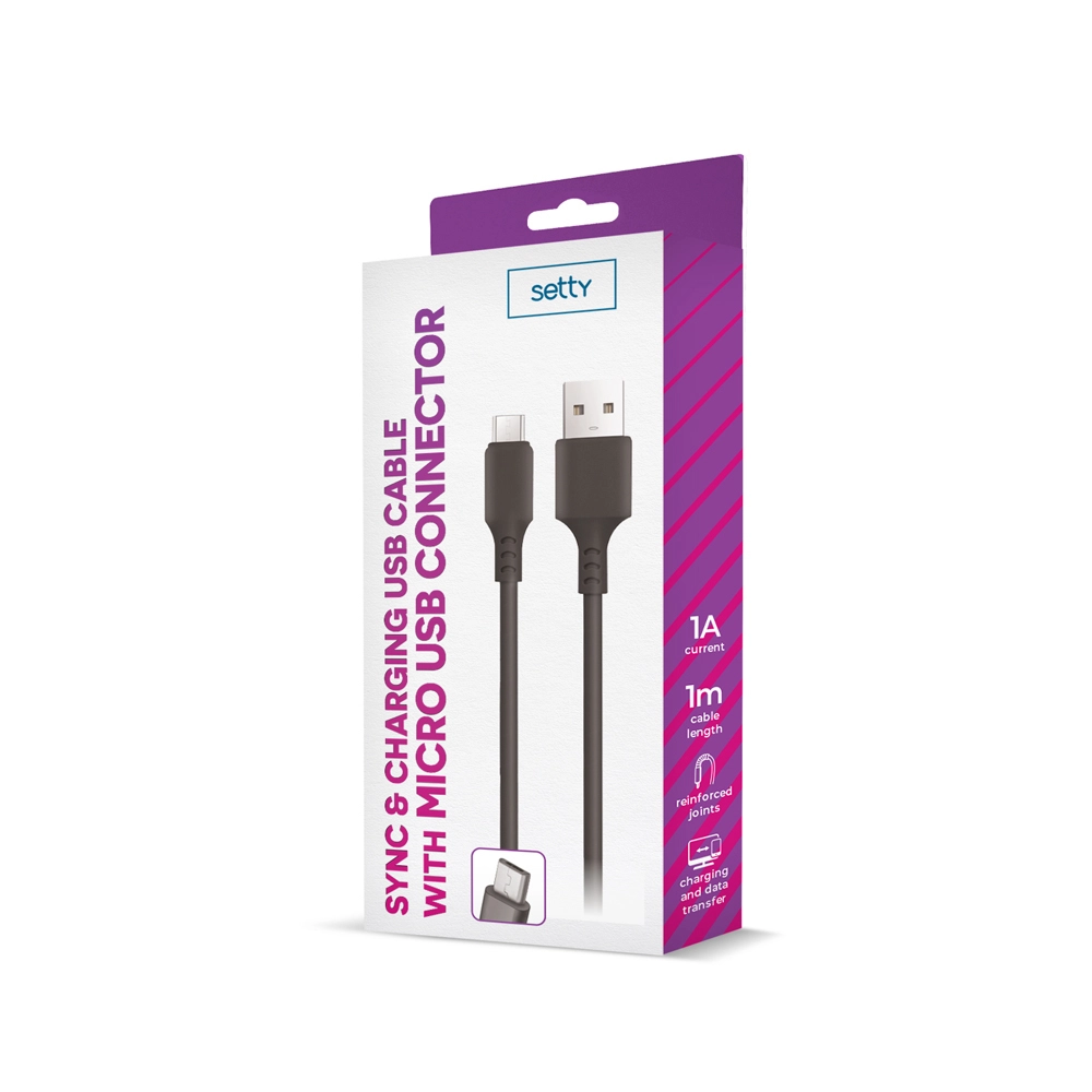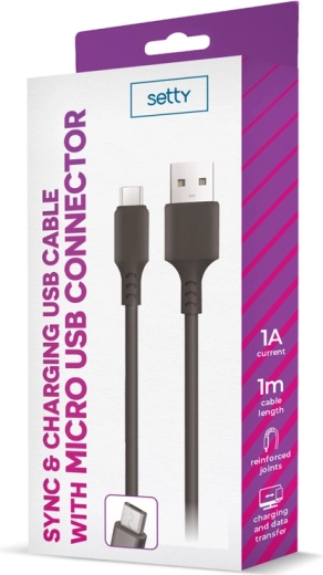 De Setty USB – microUSB-kabel is een universele accessoire voor apparaten met een micro‑USB-connector. Hij zorgt voor een stabiele verbinding met laptop, pc of oplader en biedt veilig en efficiënt opladen met een stroom tot 1 A.