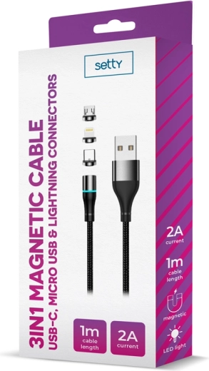 Universele magnetische USB‑kabel SETTY met een lengte van 1 m voor comfortabel opladen en gegevensoverdracht voor meerdere apparaten dankzij de verwisselbare connectoren USB‑C, Lightning en microUSB. Een extra sterke magneet houdt de connector stevig op zijn plaats, vermindert slijtage van poorten en maakt aansluiten met één hand makkelijker. De duurzame nylon gevlochten mantel zorgt voor een lange levensduur en voorkomt in de knoop raken, terwijl de stroom van 2 A betrouwbaar en snel opladen biedt.