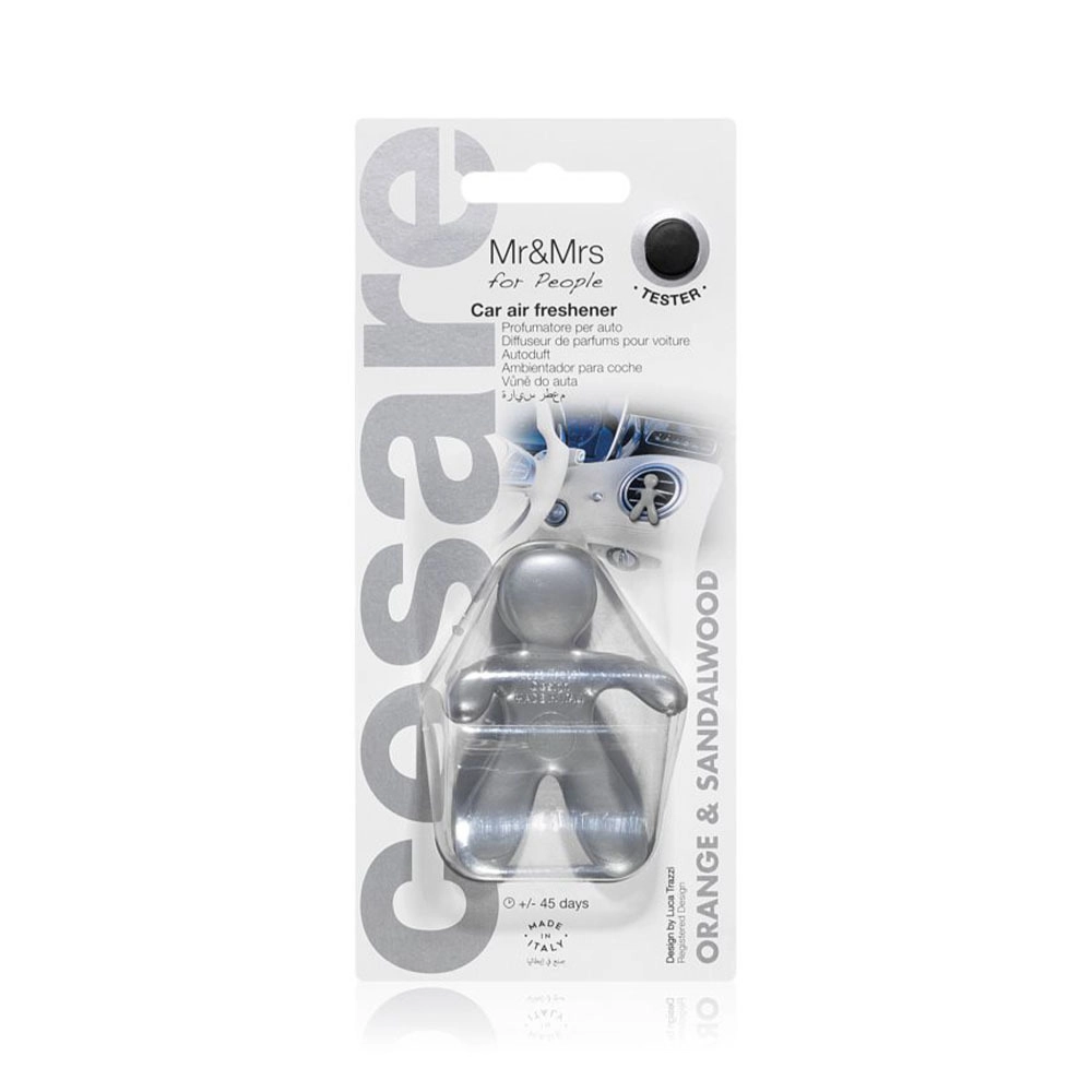 Breng nieuw leven in het interieur van je auto met de iconische geurdiffuser Mr & Mrs Fragrance Cesare in zilveren uitvoering. Het elegante poppetjesdesign klik je gemakkelijk op het ventilatierooster en met de luchtstroom komt een intense geur van sinaasappel en sandelhout vrij. De geur is samengesteld uit essentiële oliën zonder alcohol, waardoor hij aangenaam, natuurlijk en mild is.