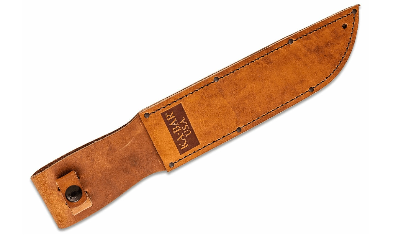 De duurzame lederen schede met riemlus zorgt voor veilig dragen en snelle toegang tot het mes in het veld.