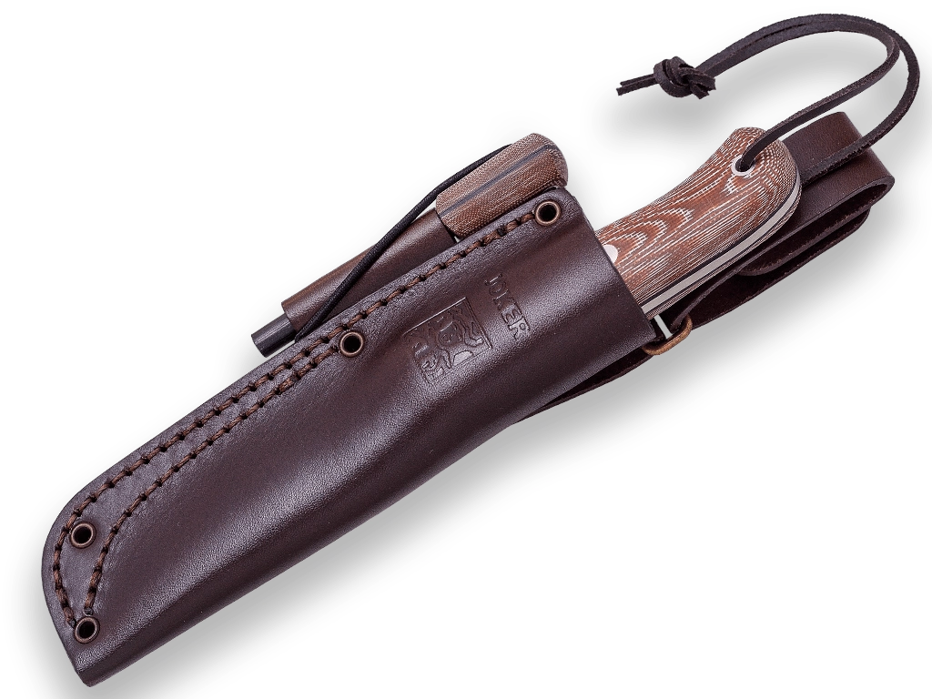 Het handvat van het composietmateriaal Micarta in bruin biedt uitstekende grip, ook bij vocht, en is voorzien van een koordoog. In het veld waardeer je de hoogwaardige leren foedraal voor veilig dragen en het geïntegreerde vuurstaal voor eenvoudig vuur maken.