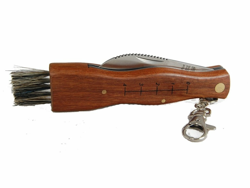 Praktisch paddenstoelenmes JOKER met een roestvrijstalen lemmet van 7 cm, ideaal gevormd voor het reinigen van paddenstoelen. Voorzien van een houten handvat met karabiner, een maataanduiding voor indicatieve meting en een borsteltje voor het schoonmaken van paddenstoelen. De set bevat een nylon etui voor veilig dragen in het veld.