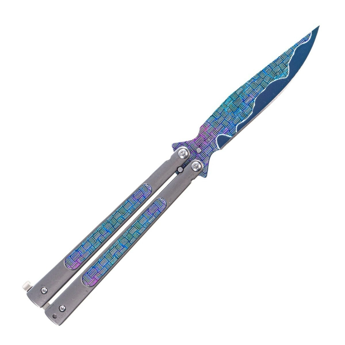 JOKER Butterfly is een balisong (vlindermes) ontworpen voor vloeiend openen door het spreiden van de handvathelften en betrouwbare vergrendeling in geopende stand met de kenmerkende sluitclip. Het roestvrijstalen lemmet met enkelzijdige slijping en beschermende coating biedt corrosiebestendigheid en langdurige scherpte. Het volledig metalen handvat met decoratieve inlay-panelen in blauw‑paarse tinten zorgt voor een stevige grip en een opvallende look.