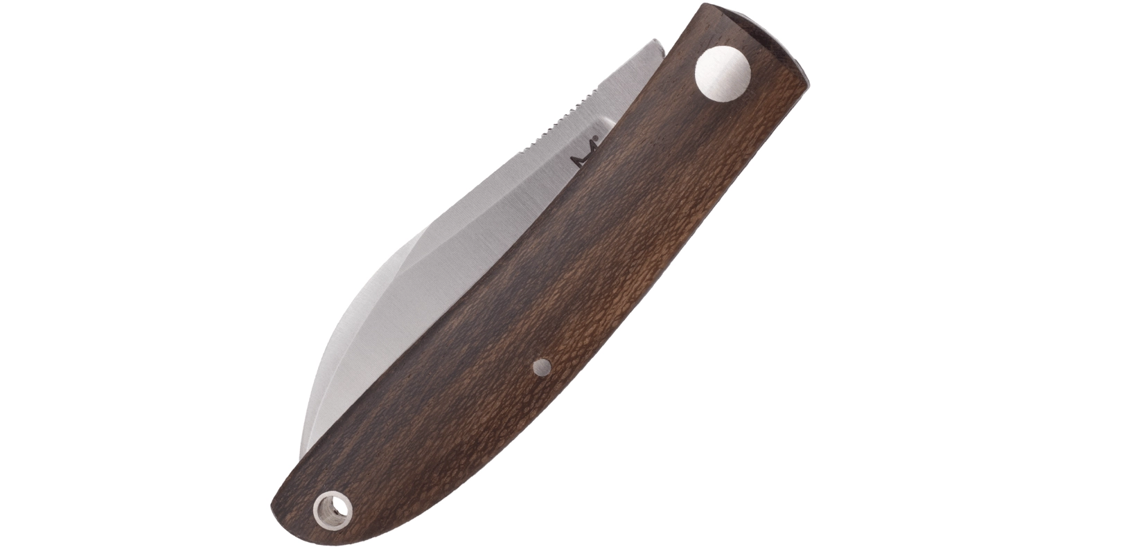 De luxueuze schalen van Ziricote-hout liggen prettig in de hand en zijn voorzien van een koordoog voor gemakkelijk uit de zak halen. Het mes wordt geleverd met een hoogwaardig leren etui dat zowel lemmet als handgreep tijdens het dragen beschermt.