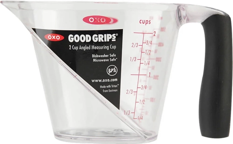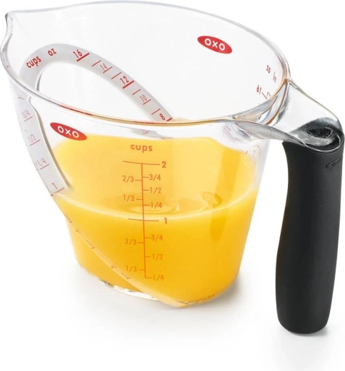 Praktische keukenmaatbeker OXO Good Grips met een inhoud van 500 ml beschikt over een gepatenteerde schuine binnenste maataanduiding voor eenvoudig aflezen van bovenaf, een comfortabele antisliphandgreep en nauwkeurig schenken zonder morsen. Gemaakt van duurzaam, transparant BPA-vrij Tritan, biedt metrische én Amerikaanse eenheden en is vaatwasserbestendig.