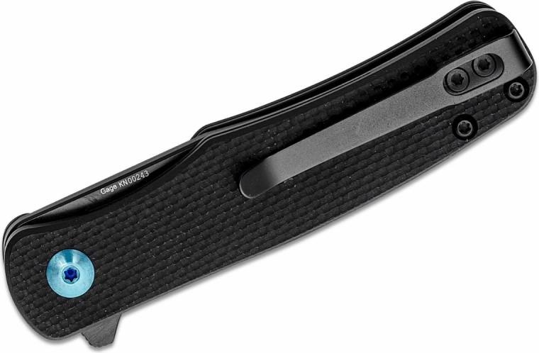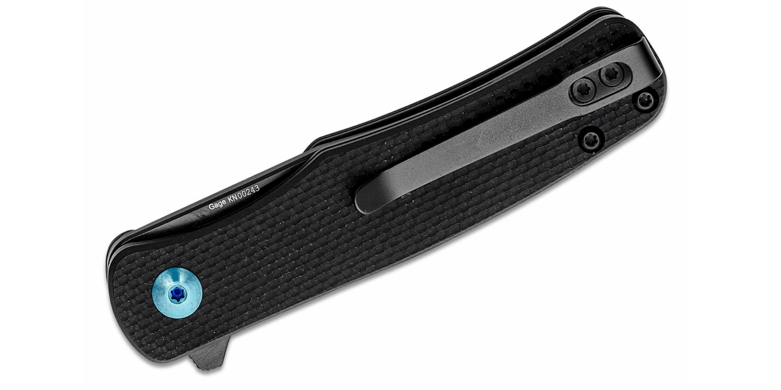 Het handvat van G10 in een elegante zwarte kleur is sterk, antislip en prettig gevormd voor een zekere grip. Dankzij de geïntegreerde clip kan het mes eenvoudig en discreet in de broekzak, aan een riem of aan de rand van een rugzak worden gedragen.