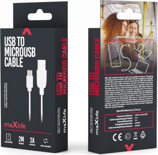 De universele Maxlife-kabel met microUSB-connector biedt snelladen 2 A, betrouwbare gegevensoverdracht en extra lengte van 2 m voor comfortabel gebruik thuis en op kantoor. De duurzame en flexibele kabel in elegante witte kleur is ideaal voor smartphones, powerbanks, koptelefoons en Bluetooth-luidsprekers.