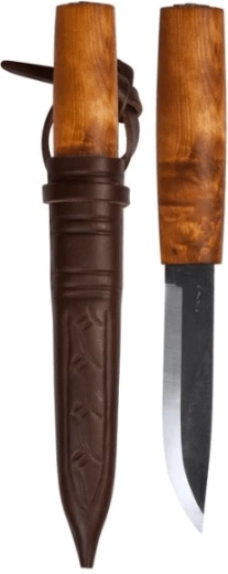 Het stevige lemmet van gelamineerd roestvrij staal met driedelige opbouw en traditionele Scandinavische slijping zorgt voor uitstekend snijvasthouden, makkelijk slijpen en schone sneden bij het werken met hout en voedsel. Het tonvormige handvat van berkenwortelhout is versmald voor een comfortabele en zekere greep, ligt natuurlijk in de hand en biedt uitstekende controle zonder pareerstang.