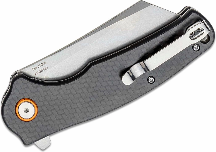 Robust en betrouwbaar zakmes CJRB Crag met een cleaver-lemmet van poedermetallurgische staalsoort AR‑RPM9 en stonewash-afwerking, geschikt voor veeleisende taken. Dankzij de compacte afmetingen ideaal voor dagelijks (EDC) dragen, zowel buiten als thuis. De flipper zorgt voor snel openen en de liner lock voor veilig gebruik, terwijl het handvat van koolstofvezel in grijs een stevige en comfortabele grip biedt.