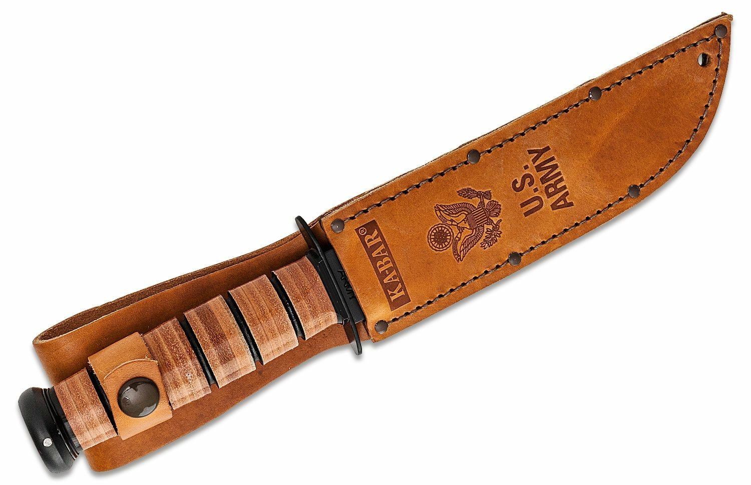De handgreep is gemaakt van geperste en geslepen lederen ringen, die zorgen voor een zekere grip en een tijdloze look. De verpakking bevat een hoogwaardige lederen schede met het symbool en opschrift U.S. ARMY, waardoor het mes klaar is voor veilige opslag of presentatie in een verzameling.