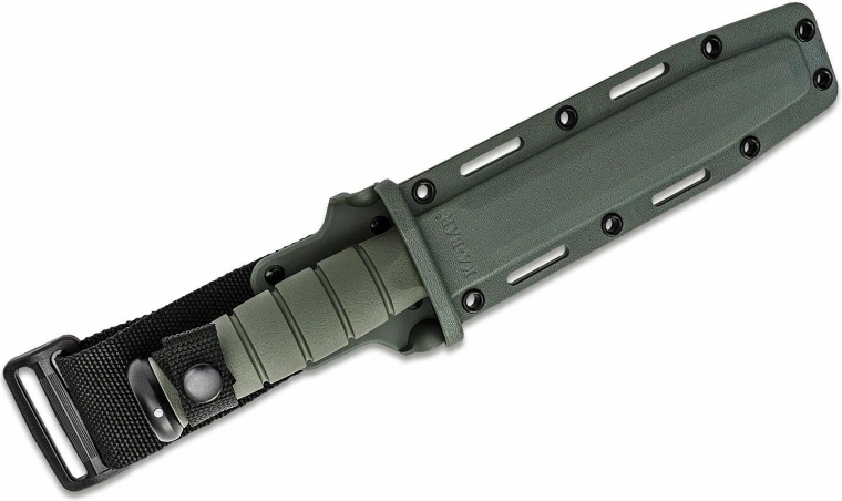 Robuust tactisch KA-BAR mes voor veeleisend gebruik in het veld en voor outdooractiviteiten. Voorzien van een vaste 1095 Cro-Van lemmet met zwarte corrosiebestendige afwerking, een antislip Kraton handgreep in groen en een kunststof schede voor veilig dragen.