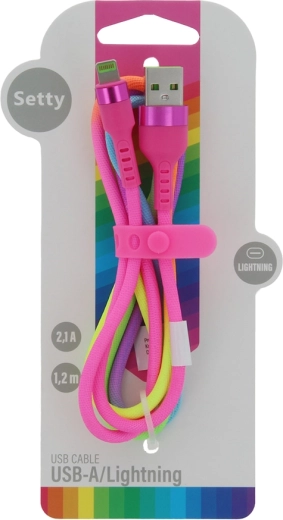 Universele Setty USB–Lightning-kabel van 1,2 m voor snel opladen en betrouwbare gegevensoverdracht tussen apparaten met USB‑A- en Lightning-aansluitingen. Dankzij de stroom tot 2,1 A laadt hij efficiënt uw iPhone of iPad op, terwijl het regenboogdesign uw accessoires een stijlvol accent geeft.