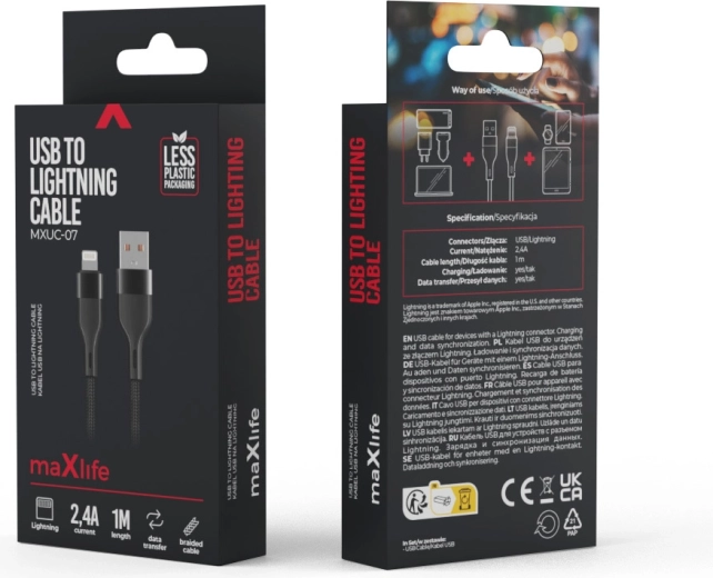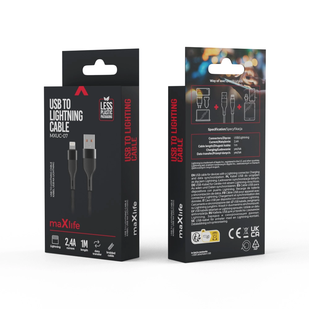 De Maxlife USB–Lightning-kabel onderscheidt zich door een stevige constructie met textiele omvlechting, die de weerstand tegen slijtage, breuken en knopen vergroot. Versterkte trekontlasting bij beide connectoren verlengt de levensduur, ook bij regelmatig aansluiten.