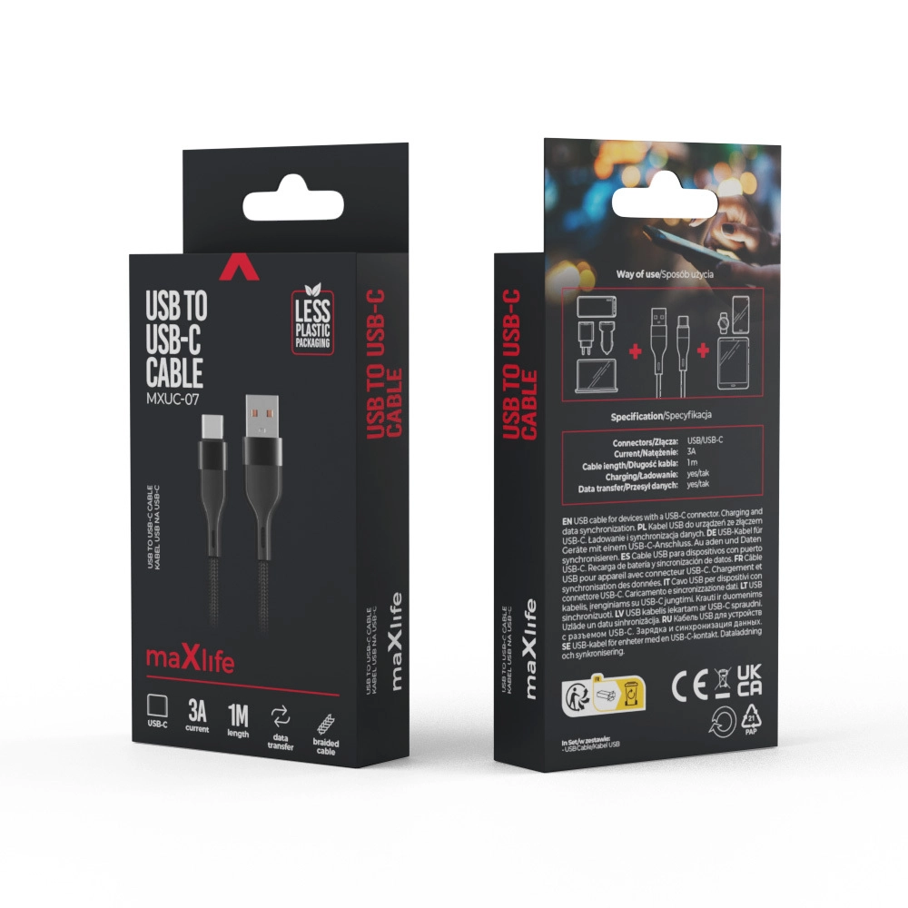 De praktische Maxlife-kabel combineert eenvoud en duurzaamheid. De nylon vlecht beschermt de aders tegen knikken en slijtage, terwijl de versterkte uiteinden zorgen voor een stabiele verbinding bij frequent in- en uitpluggen. Met een stroom tot 3 A ondersteunt hij snel opladen van compatibele telefoons, tablets en andere apparaten met een USB‑C-poort.
