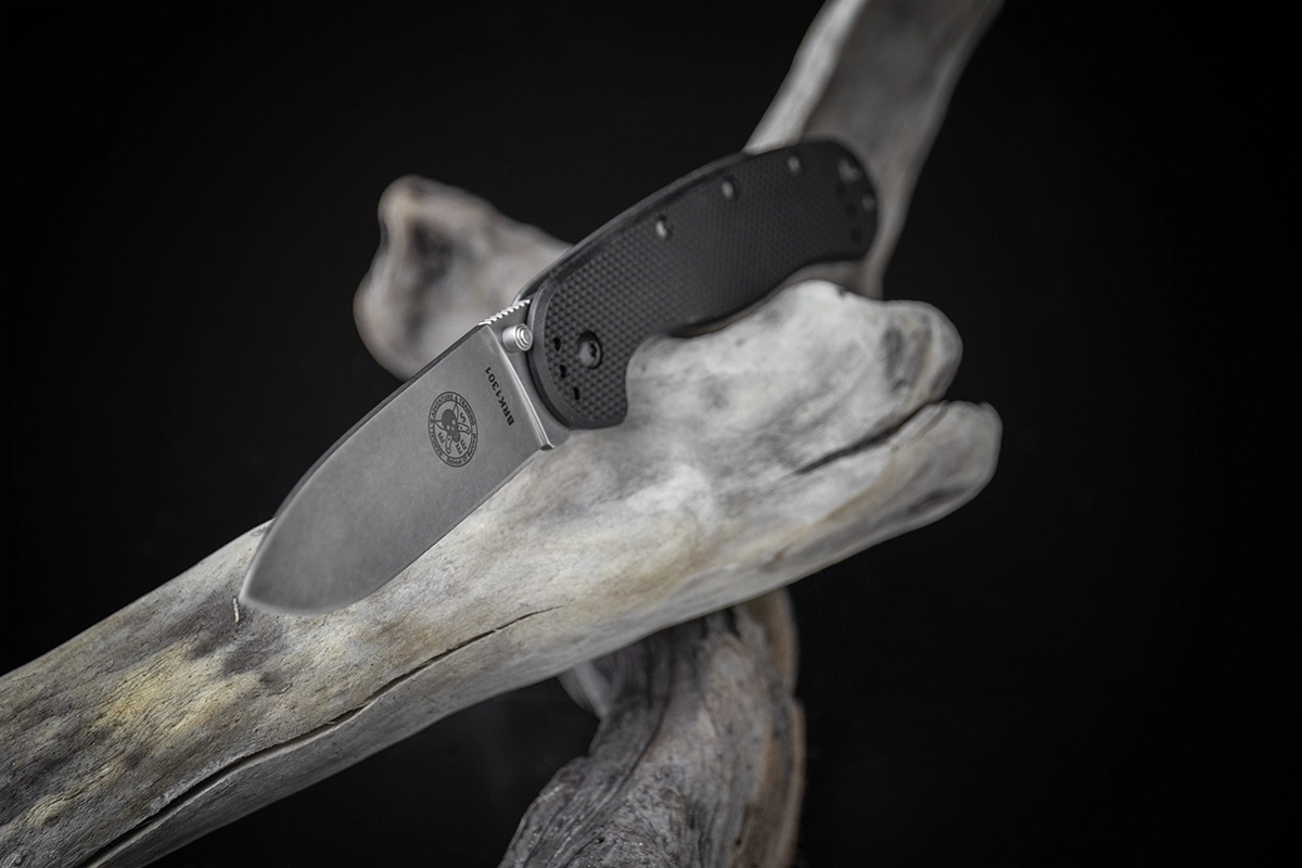 Het lemmet van gereedschapsstaal D2 met matte stonewash finish behoudt het snijvlak uitstekend en camoufleert gebruikssporen beter.