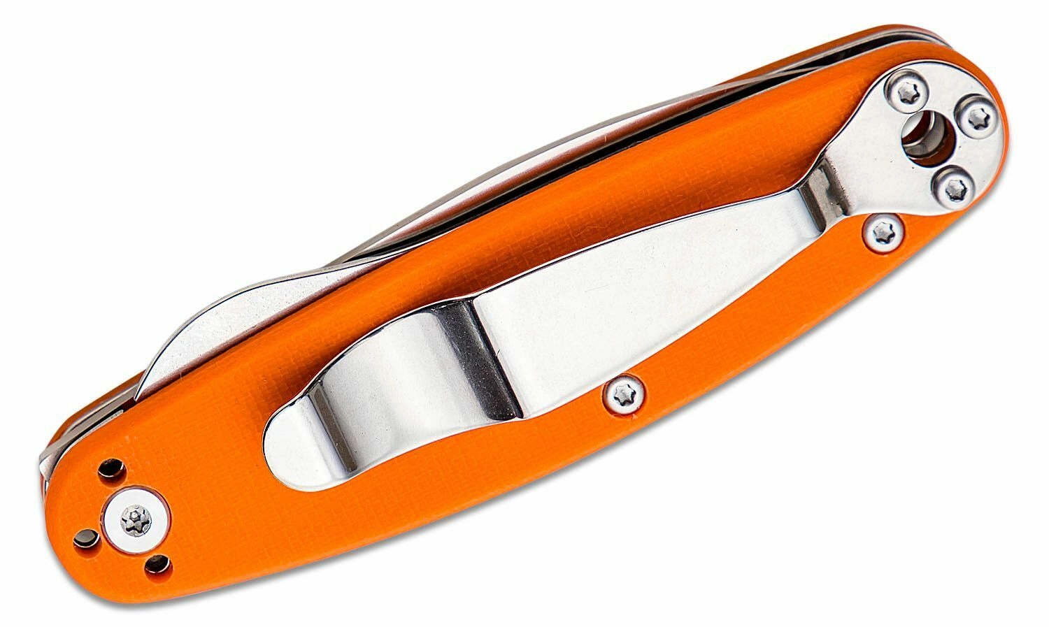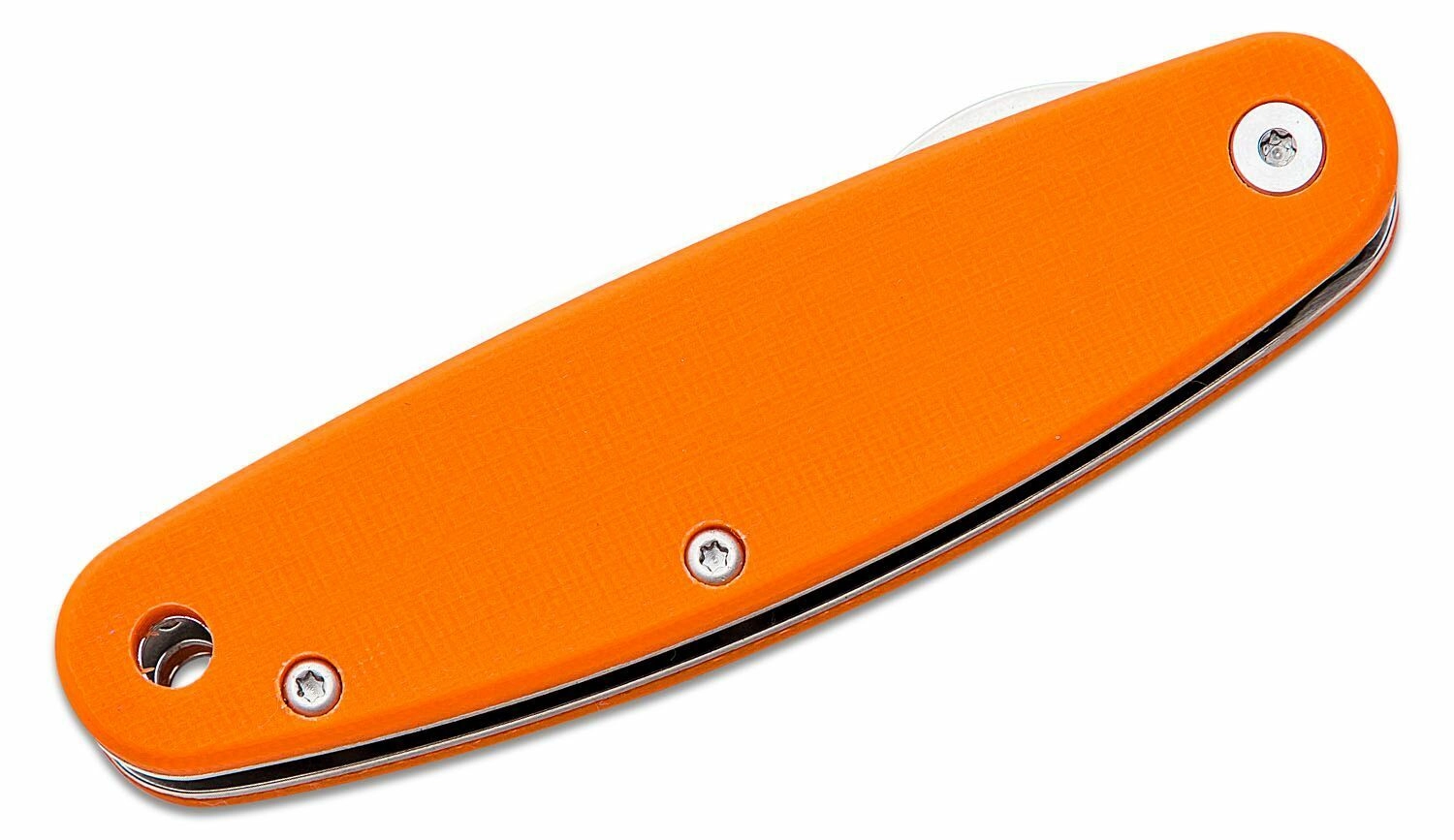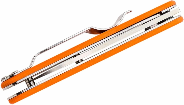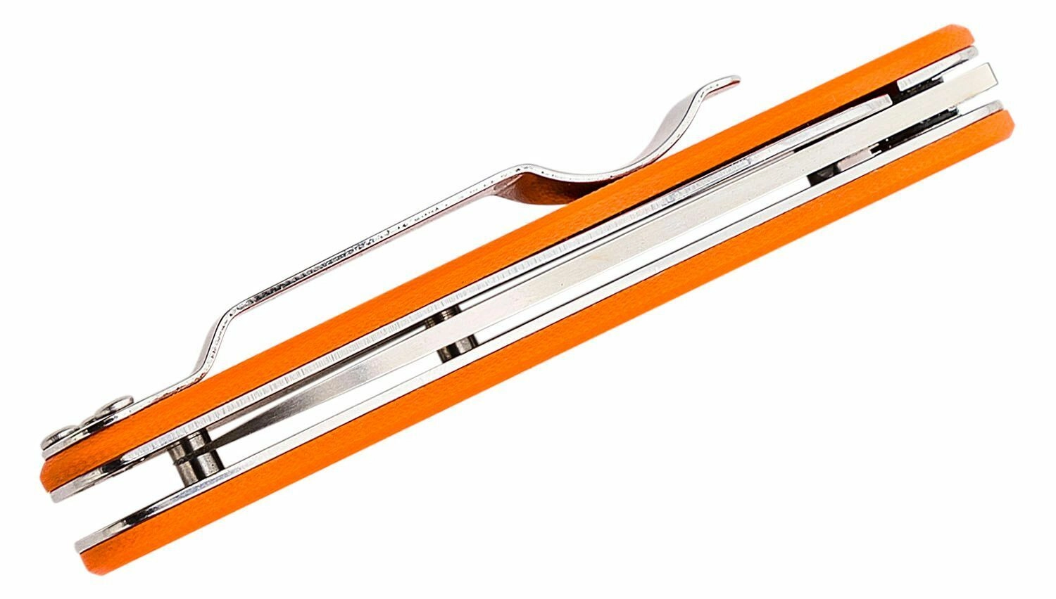 Oranje G10 schalen met metalen liners zorgen voor een stevige greep en hoge duurzaamheid bij dagelijks gebruik.