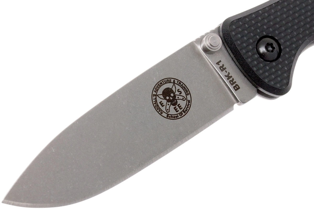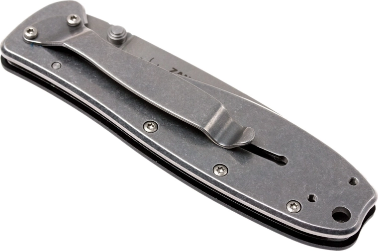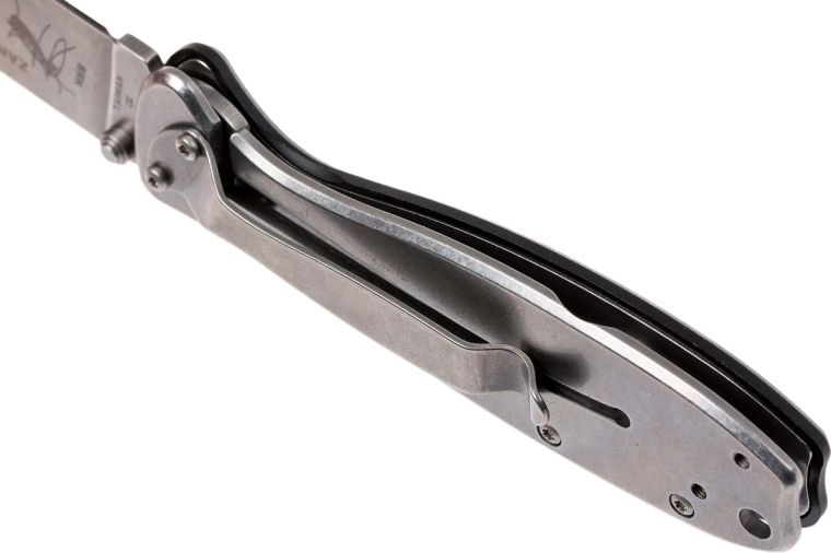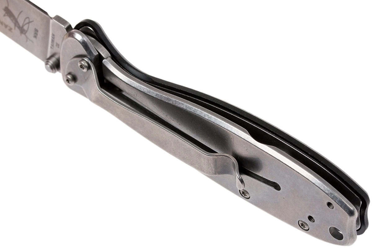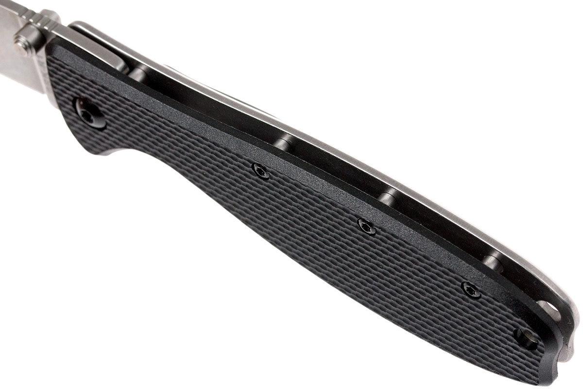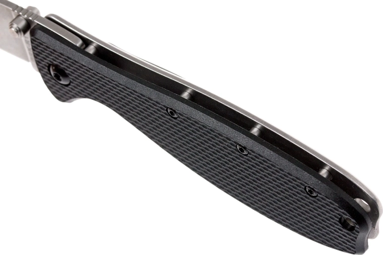 Getextureerde zwarte FRN-schalen zorgen voor een stevige grip; in het handvat zitten een koordoog en een clip voor comfortabel dragen in de broekzak.