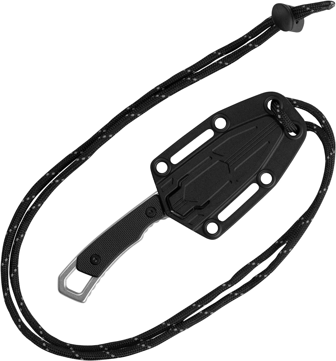 De ergonomische handgreep van zwart GFN (met glasvezel versterkt nylon) zorgt voor een zekere grip en uitstekende controle tijdens het werk. Meegeleverd zijn een lichte kunststof schede en een paracordsnoer voor discreet en veilig dragen om de hals.