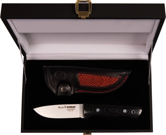 Premium jachtmes Muela Kodiak met vaste 10 cm lemmet van eersteklas staal RWL-34 biedt een uitstekende snede, duurzaamheid en een zekere grip. Full-tang constructie, zwart handvat van Micarta met rode liner en leren schede maken het tot een betrouwbare tool voor jacht, bushcraft en dagelijks dragen.