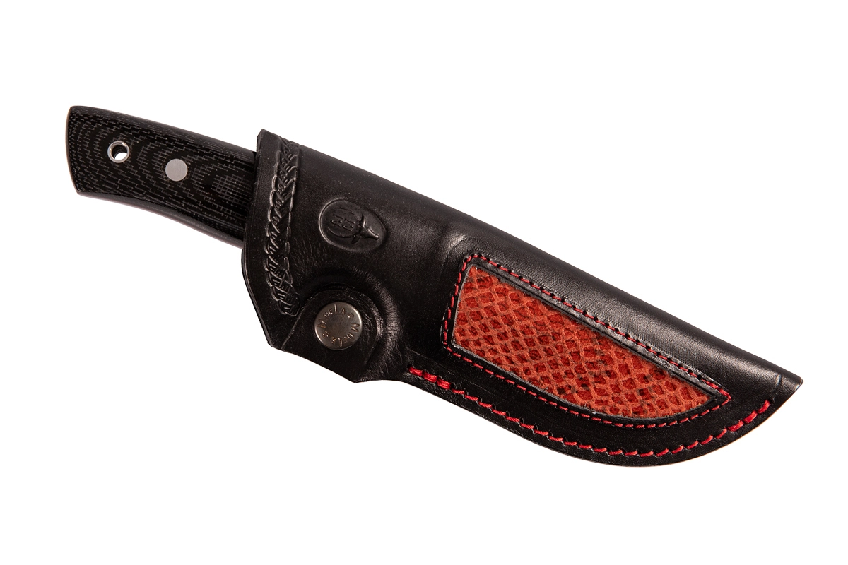 De ergonomische greep van Micarta in zwart met een elegante rode liner biedt een zekere grip, ook in natte omstandigheden. Het koordoog vergemakkelijkt zekering of ophangen. Inbegrepen is een versierde leren schede met riemlus, die veilig dragen en snelle toegang tot het mes verzekert. Geleverd in een geschenkdoos – ook ideaal als representatief cadeau.