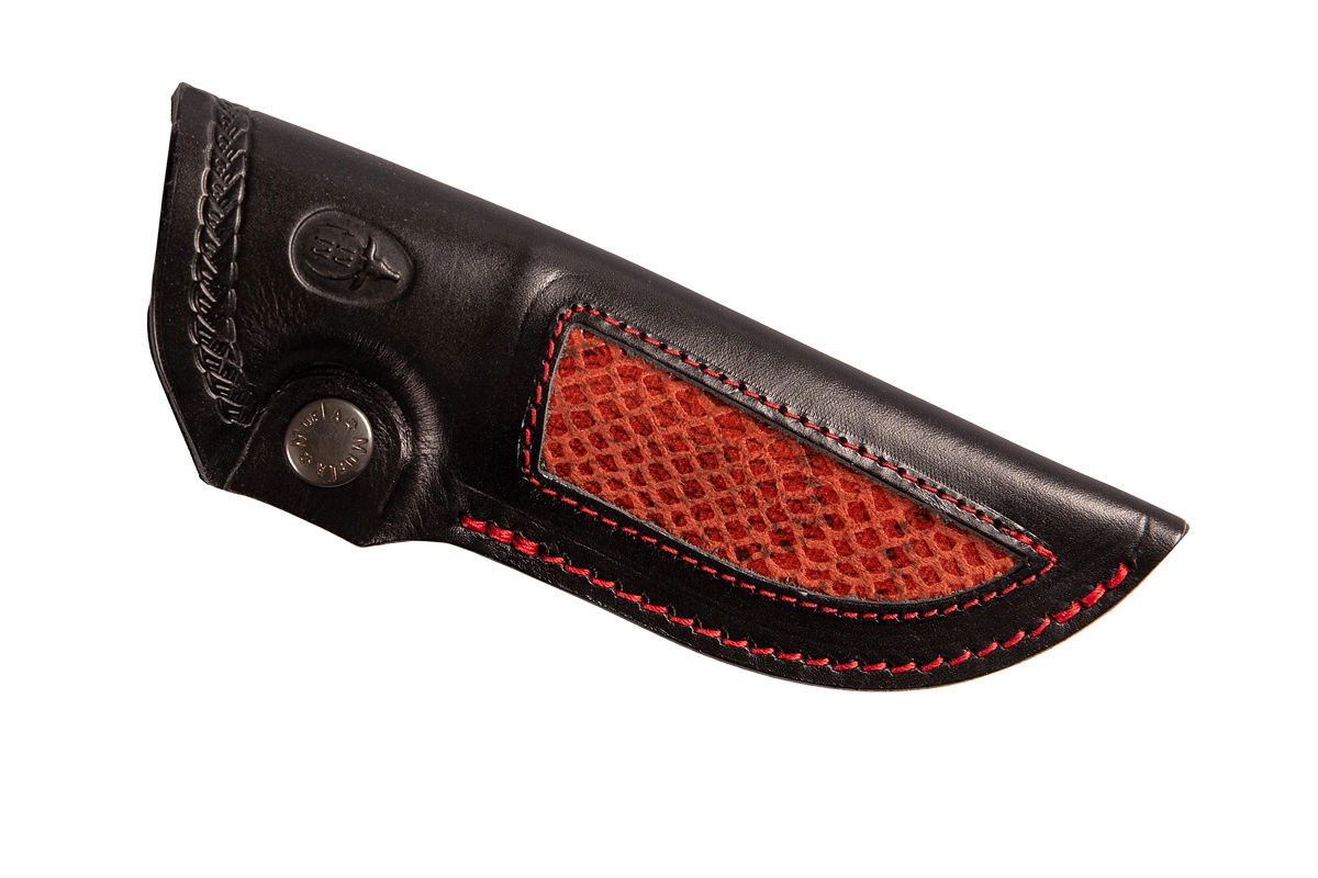 Versierde leren schede met stevige drukknoop en mogelijkheid tot bevestiging aan de riem beschermt het mes tijdens vervoer en biedt snelle toegang.