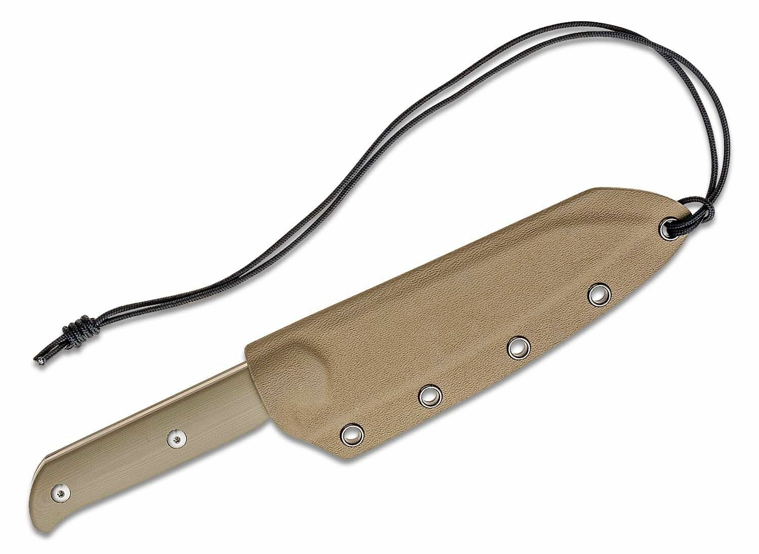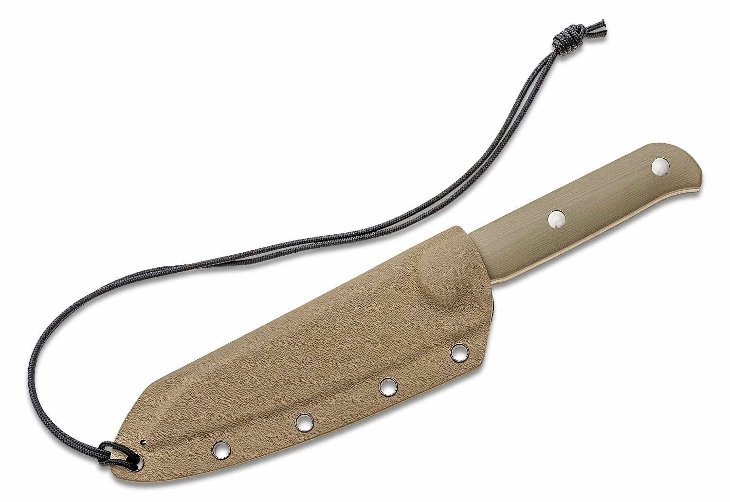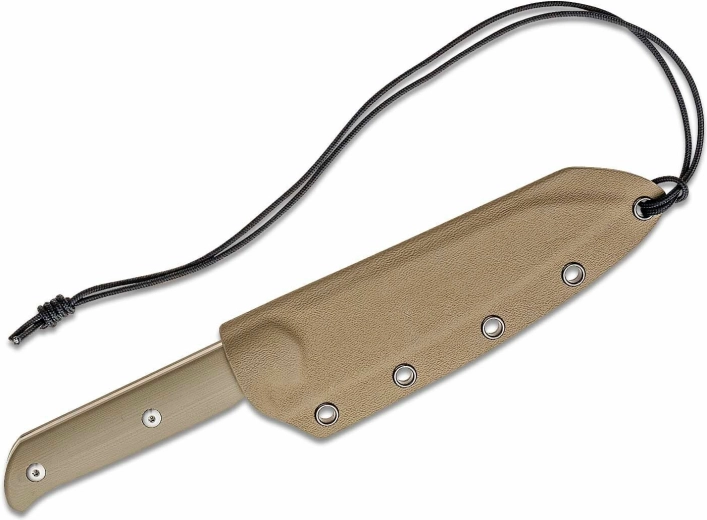 Het ergonomische handvat van G10 in woestijnbruin zorgt voor een zekere grip, ook onder veeleisende omstandigheden. De full-tang constructie met drie roestvrijstalen klinknagels garandeert hoge duurzaamheid en stabiliteit. De Kydex schede met koord maakt veilig dragen en snel trekken mogelijk, zodat u het mes altijd bij de hand hebt.