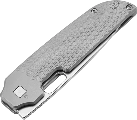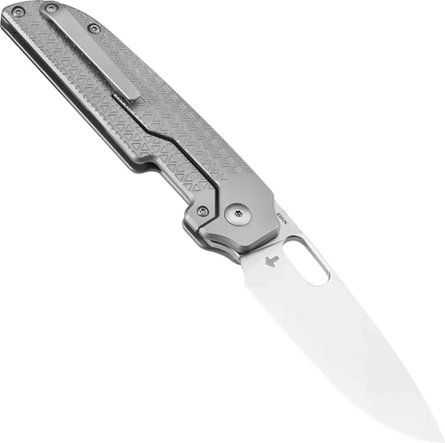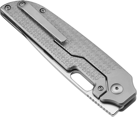 Het compacte profiel en de precieze mechaniek maken vloeiende éénhandige opening mogelijk via het duimgat in het lemmet of de front flipper. De framelock vergrendelt het lemmet veilig tijdens gebruik, terwijl de titanium handgreep met geometrische frezing zorgt voor een zekere grip en een moderne uitstraling.