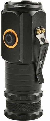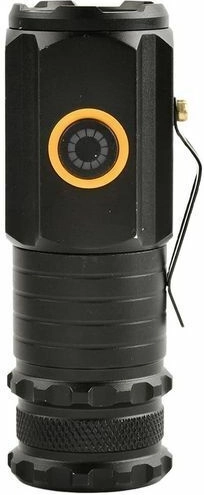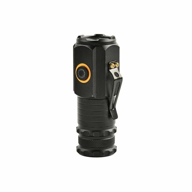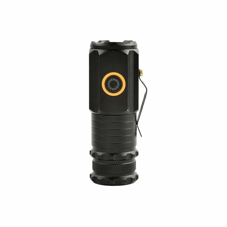 De bediening is eenvoudig met de zijknop: snel schakelen tussen hoog–medium–laag, stroboscoop met lang ingedrukt houden en turbo met dubbelklikken. De voeding komt van de meegeleverde 18350 (1100 mAh) met opladen via USB‑C; de laadindicator licht rood op. Voor maximale praktische inzetbaarheid is er een magnetische basis en een aluminium clip.