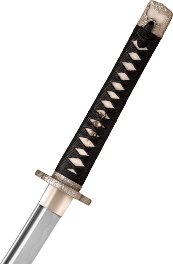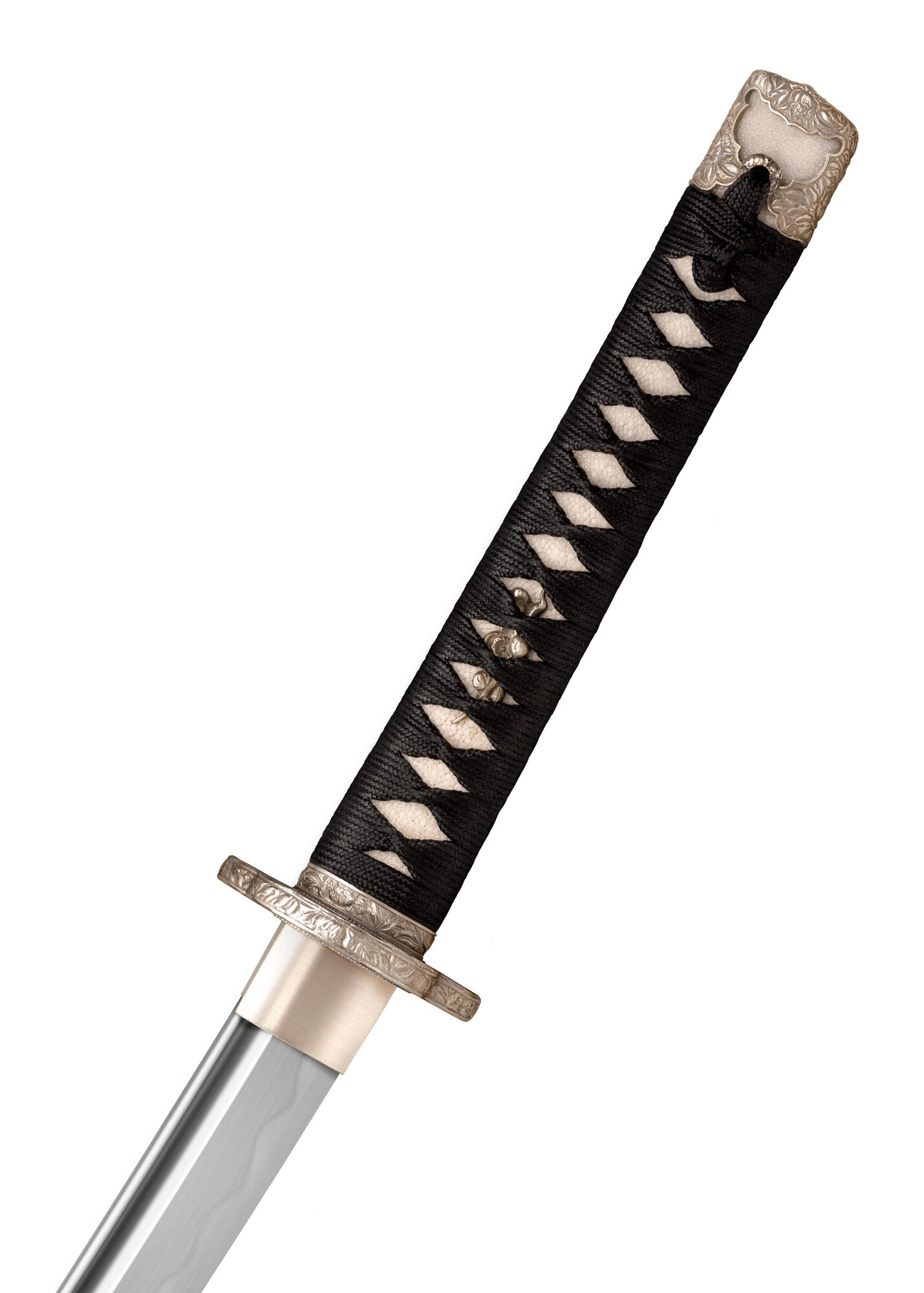 Het handvat met traditionele omwikkeling van zwarte zijden koord over echte ray skin (same) en menuki biedt comfort, controle en een authentieke uitstraling.