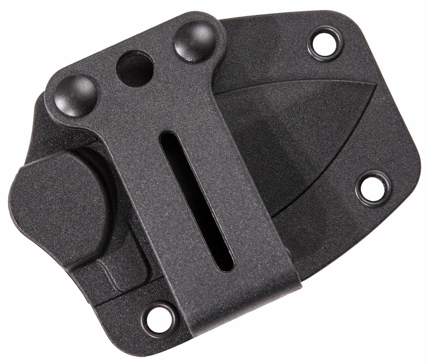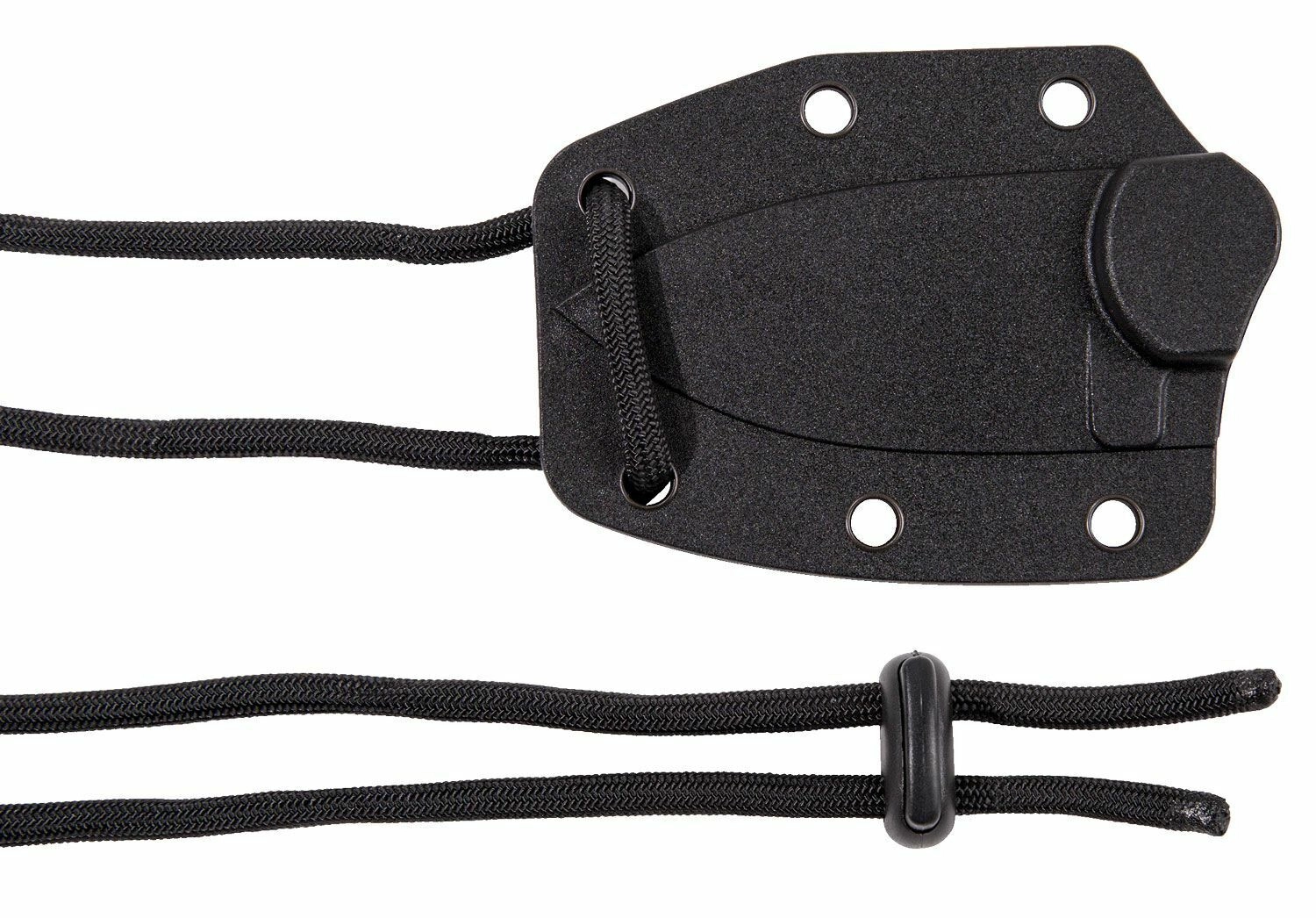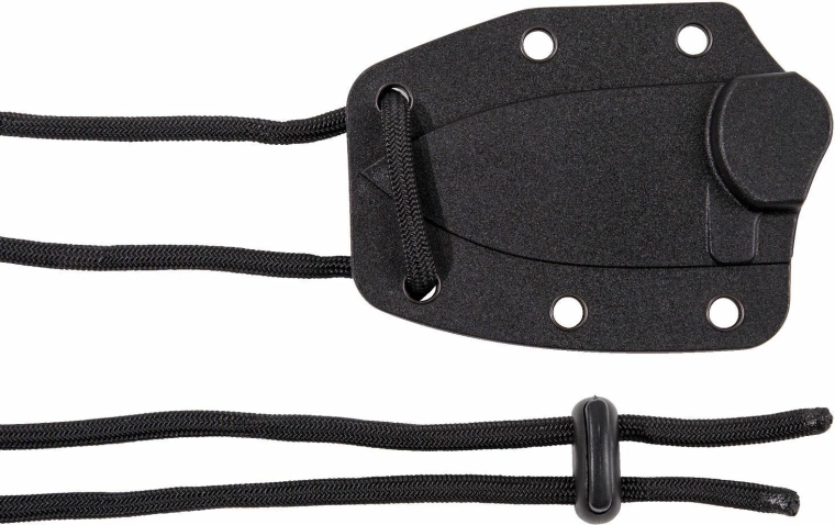 Thermoplastische schede met paracord en montageclip maakt variabele bevestiging mogelijk aan de nek, uitrusting of riem.