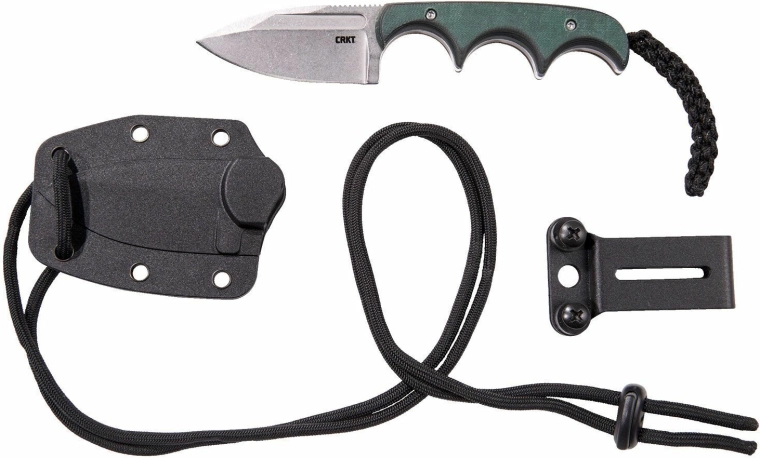 Compact en licht nekmes CRKT Minimalist Spear Point met een vast lemmet van 8Cr13MoV staal en een stonewash finish, ideaal voor EDC, outdoor en jacht. De ergonomische Micarta handgreep met drie uitgesproken vingergroeven biedt een zekere grip, terwijl de thermoplastische schede met bevestigingsopties zorgt voor veilig en discreet dragen aan de nek of aan de riem.