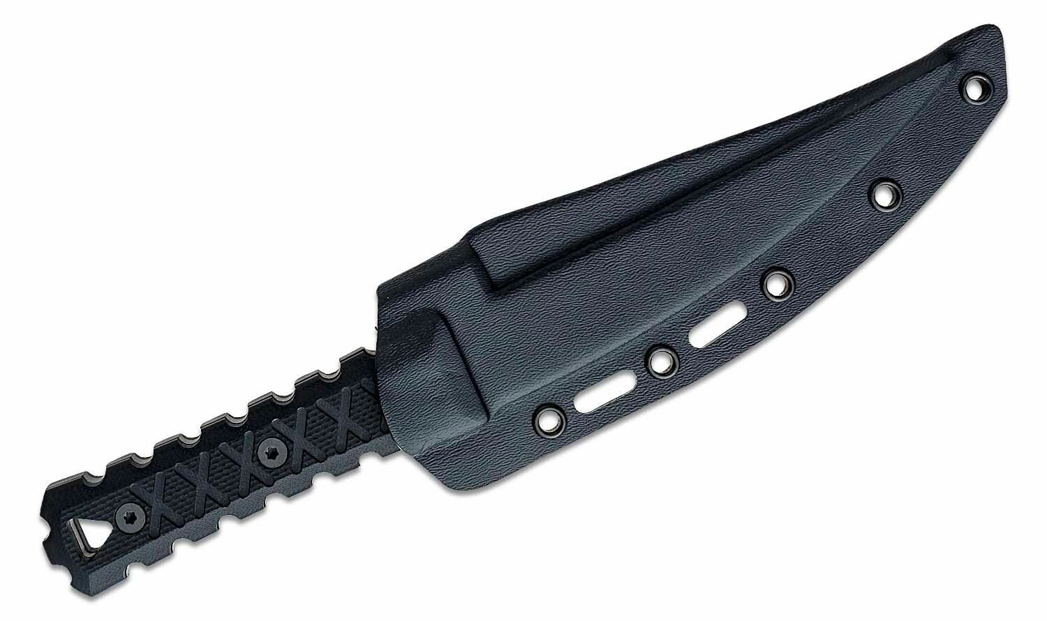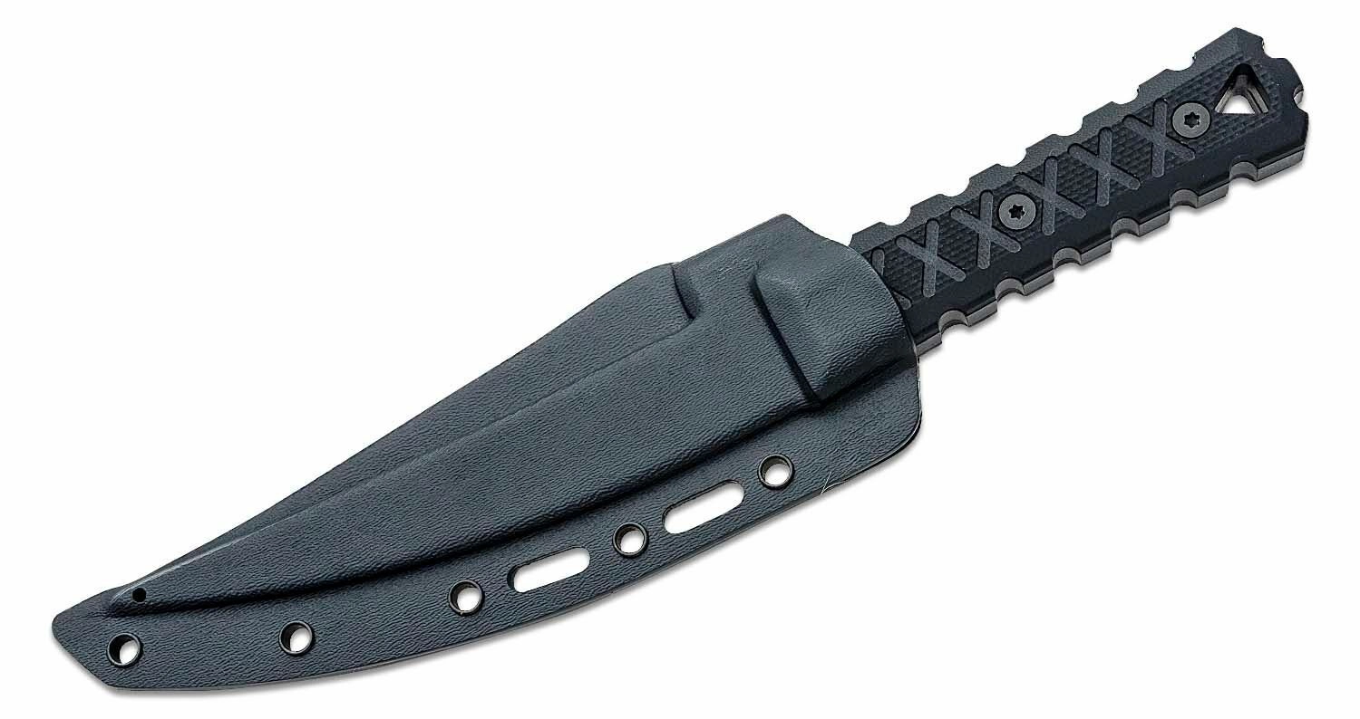 De ergonomische handgreep van G10 in zwart zorgt voor een zekere grip, ook nat of met handschoenen. De meegeleverde Boltaron schede ondersteunt meerdere bevestigingsopties en veilig dragen aan riem of uitrusting.
