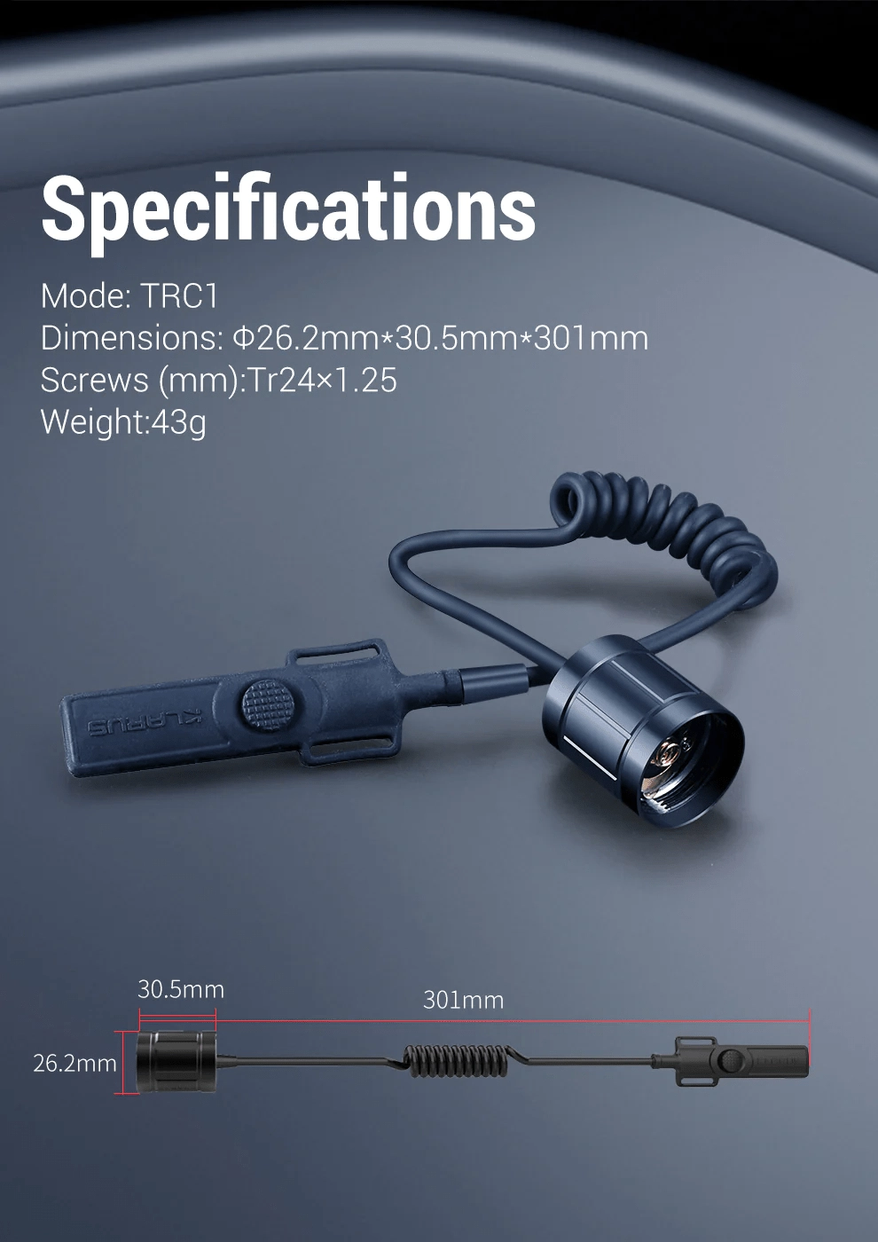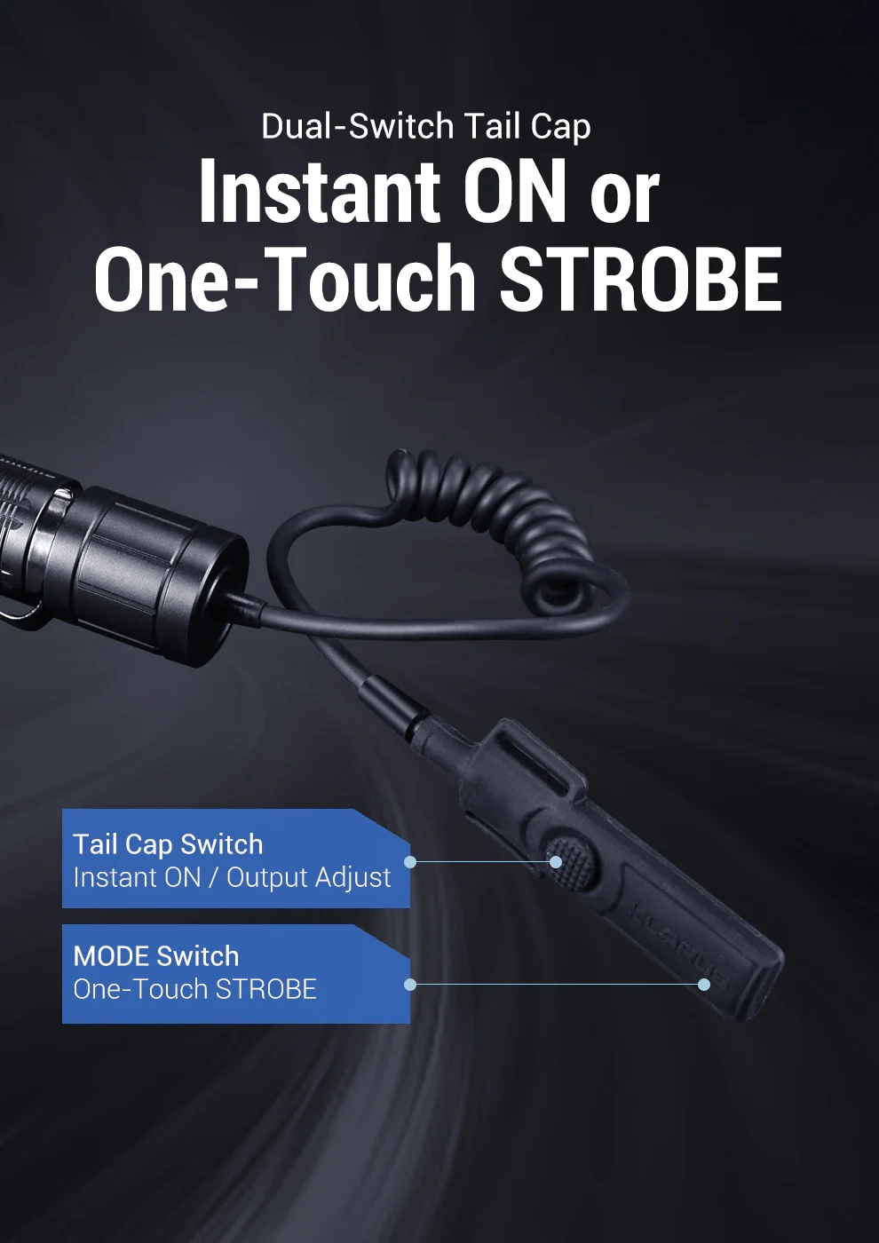 De afstandsbediende kabelschakelaar Klarus TRC1 biedt snelle en betrouwbare bediening, zowel tactisch als in het veld. Hij heeft twee afzonderlijke schakelaars – een ronde knop voor onmiddellijk 100% licht (momentaan en constant) en een langwerpige knop voor directe STROBE. Compatibel met zaklampen XT11GT PRO V2 en XT2CR PRO, met een slijtvaste PU-kabel en een levensduur tot 100.000 actuaties.
