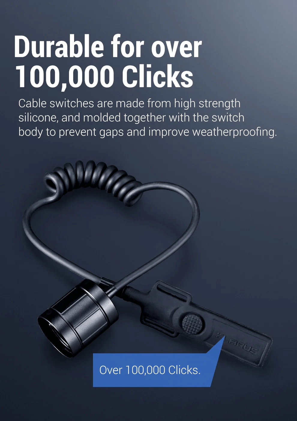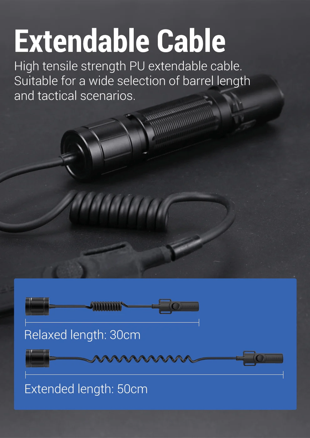 De schakelaar is ontworpen met focus op duurzaamheid en betrouwbaarheid. De hoogsterkte PU spiraalkabel past zich flexibel aan verschillende lengtes aan (ca. 30–50 cm) en aan tactische grepen. Siliconen knoppen zijn direct in de behuizing gegoten, waardoor kieren worden geminimaliseerd en de weerbestendigheid toeneemt. Een levensduur tot 100.000 klikken garandeert langdurig probleemloos gebruik.