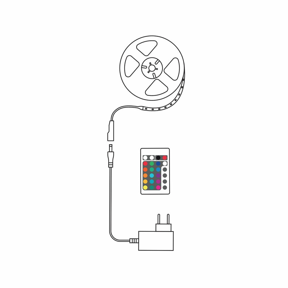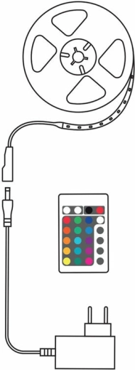 Inhoud van de verpakking: 1× 5 m LED-strip, 1× voedingsadapter met EU-stekker (150 cm), 1× afstandsbediening (incl. CR2025-batterij).