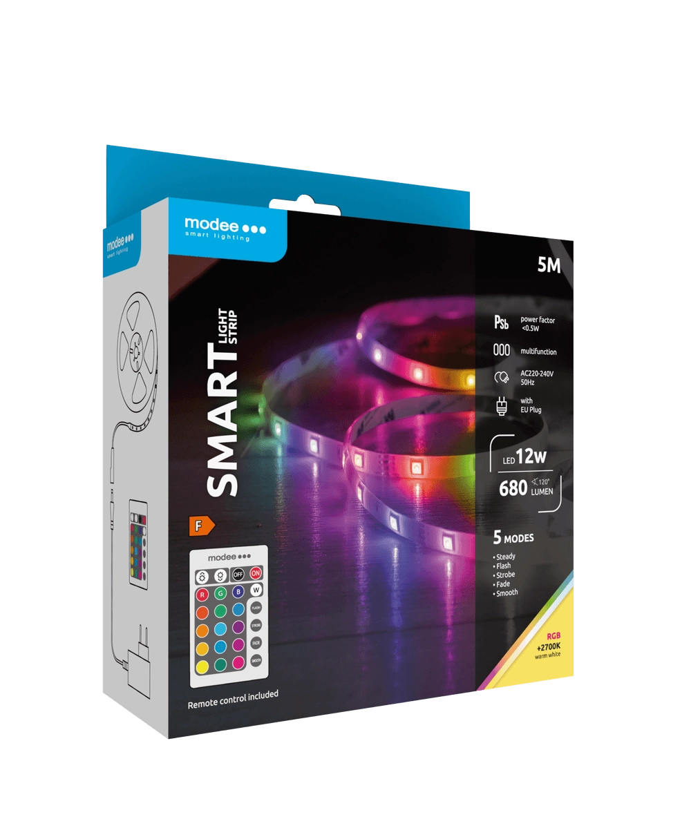 Ontdek veelzijdige verlichting met de slimme MODEE LED-strip, die zowel een gezellige warmwitte 2700K gloed als kleurrijke RGB-effecten voor elke stemming aankan. Bediening is kinderspel dankzij de afstandsbediening – verander kleuren, helderheid en programma met één druk op de knop. De geheugenfunctie onthoudt bovendien de laatst gebruikte modus.