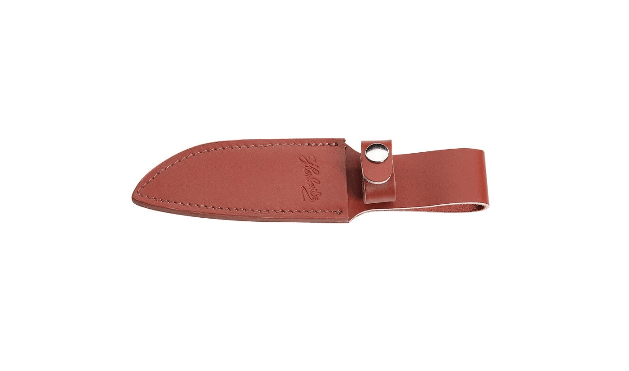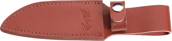 De handgreep van palissanderhout is ergonomisch gevormd en voorzien van groeven voor een zekere en comfortabele grip. De geïntegreerde pareerstang verhoogt de veiligheid tijdens het werken. Het mes wordt geleverd met een hoogwaardige leren schede voor veilig en stijlvol dragen aan de riem.